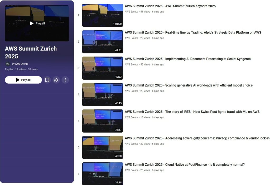 You can directly navigate to the AWS Summit Zurich 2025 Youtube playlist by clicking on the below picture. The playlist with the recorded sessions from AWS Summit Zurich 2024 is available here.