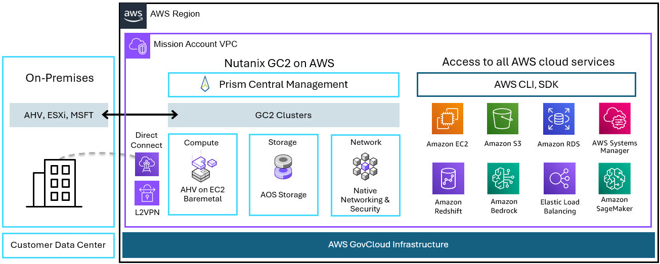 Nutanix GC2 on AWS GovCloud (US) offers enterprises a seamless hybrid cloud experience that bridges their on-premises Nutanix environment with the scalability and services of AWS.