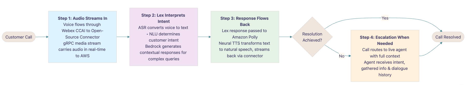 The new open source Amazon Lex connector for Webex Contact Center brings intelligent virtual agents into your existing Cisco environment, without rebuilding from scratch. Amazon Lex now plugs directly into Cisco’s Bring Your Own Virtual Agent (BYOVA) framework. With the Amazon Lex integration, you can access a powerful AI-driven virtual agent alongside your contact center workflows without any additional work, providing consistency across voice experiences. Your customers get natural, voice-driven interactions. Your team retains their existing Webex workflows, reporting dashboards, and agent desktop configurations while gaining AI capabilities that would otherwise require months of integration work.