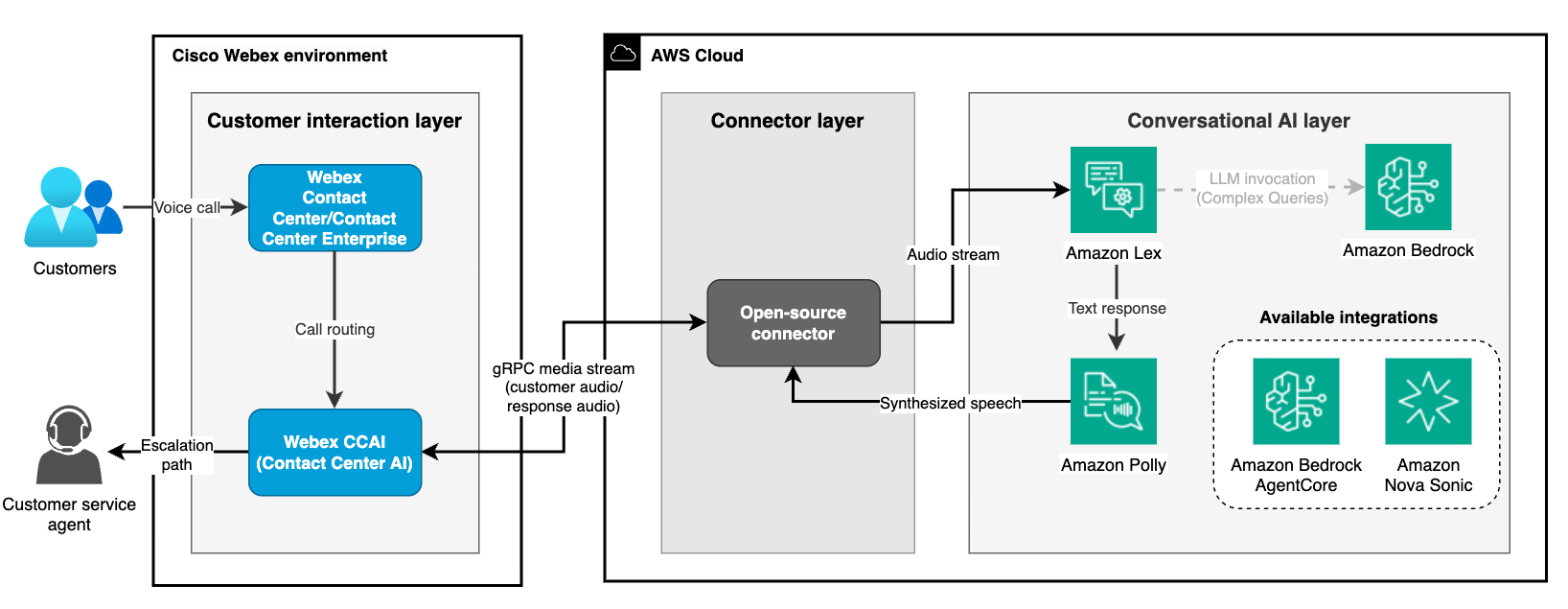 - Connector layer – The open-source connector serves as the technical bridge between platforms, authenticating between Webex and AWS environments, managing real-time gRPC media streams for audio, and orchestrating the conversation flow between platforms.