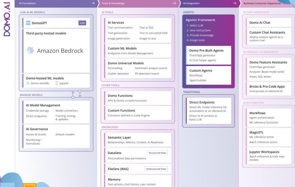 Domo’s AI architecture, shown in Figure 1, represents a sophisticated end-to-end solution that transforms raw AI capabilities into business-ready applications.