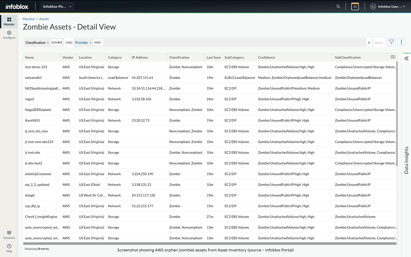 For CloudOps administrators, the Infoblox Portal serves as a powerful command center for efficient asset management. The Assets Dashboard provides an immediate overview of the entire cloud environment, highlighting key metrics and potential issues at a glance. Administrators can easily filter and drill down into specific zombie assets, accessing detailed information about each resource. This granular visibility enables quick decision-making and efficient resource cleanup, helping organizations maintain optimal cloud spending while reducing their security attack surface. The intuitive interface consolidates data from multiple AWS accounts and regions, eliminating the need to switch between different consoles. This centralized approach not only saves time but also ensures consistent asset management across the entire organization.