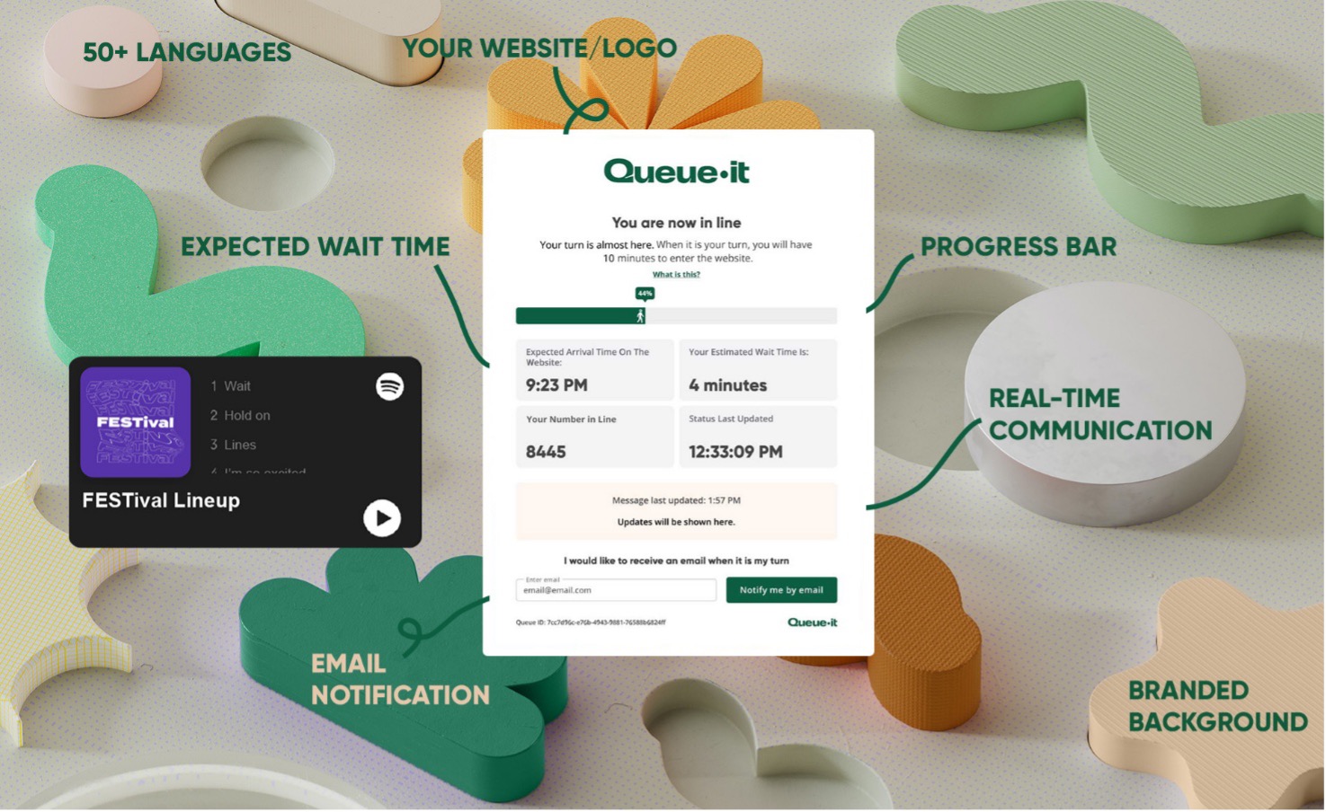 The customer experience during peak traffic shifts from encountering crashes and errors to receiving controlled access with clear communication. Queue-it provides first-in-first-out access through centralized request management or randomized access options for limited-inventory scenarios. Waiting visitors receive information including queue position, expected wait time, and progress indicators. Email notifications can alert visitors when their turn arrives. Visitors can queue across devices, and customizable branded waiting room pages maintain brand presence throughout the experience.