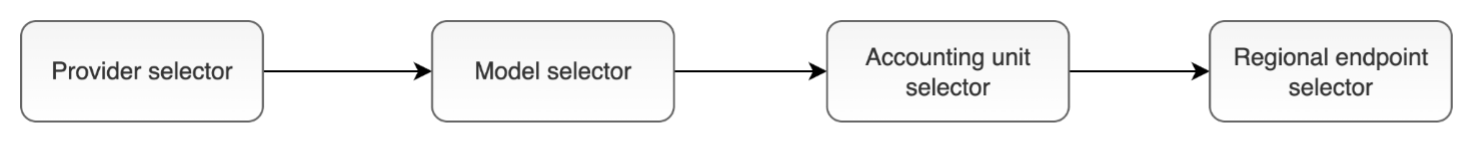 1. Provider selection – You can integrate multiple model providers, including cloud and on-premises solutions. The provider selector automatically routes requests to providers with available endpoints.