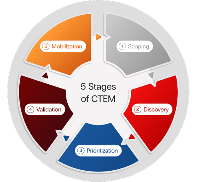 Introduced by Gartner in 2022, CTEM reframes vulnerability management through five stages: Scoping, Discovery, Prioritization, Validation, and Mobilization. The CTEM framework focuses finite security resources on exposures most likely to be exploited in specific environments. The following graphic illustrates the constant cycle of moving through these five stages.