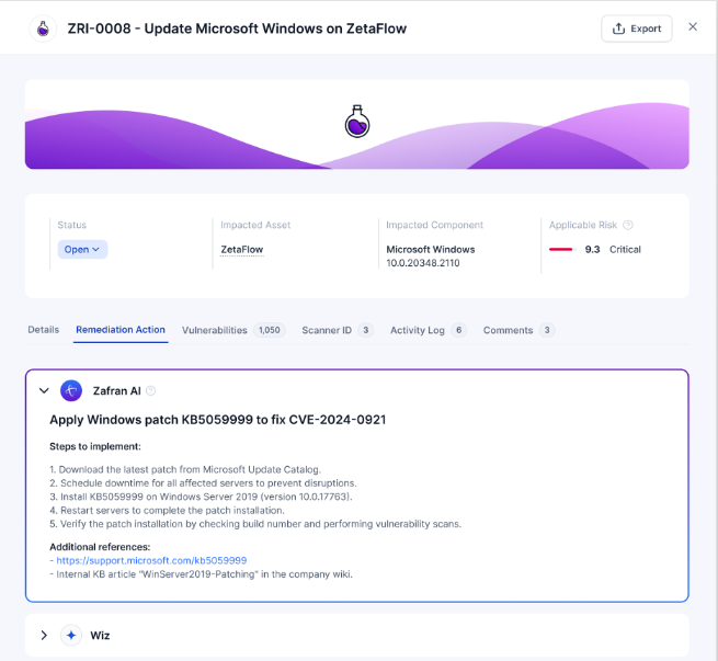 CTEM’s fifth phase, Mobilization, represents where vulnerability management programs often stall. Tickets accumulate, ownership remains unclear, and MTTR increases. Zafran’s Agentic Remediation™ solves this challenge with AI-powered automation. Zafran’s generative AI engine, powered by Amazon Bedrock, consolidates overlapping CVEs into streamlined, high-fidelity tickets containing clear, step-by-step remediation actions. This eliminates redundant work and reduces noise for remediation teams. The following screenshot shows the UI for the remediation workflow with step-by-step patching.