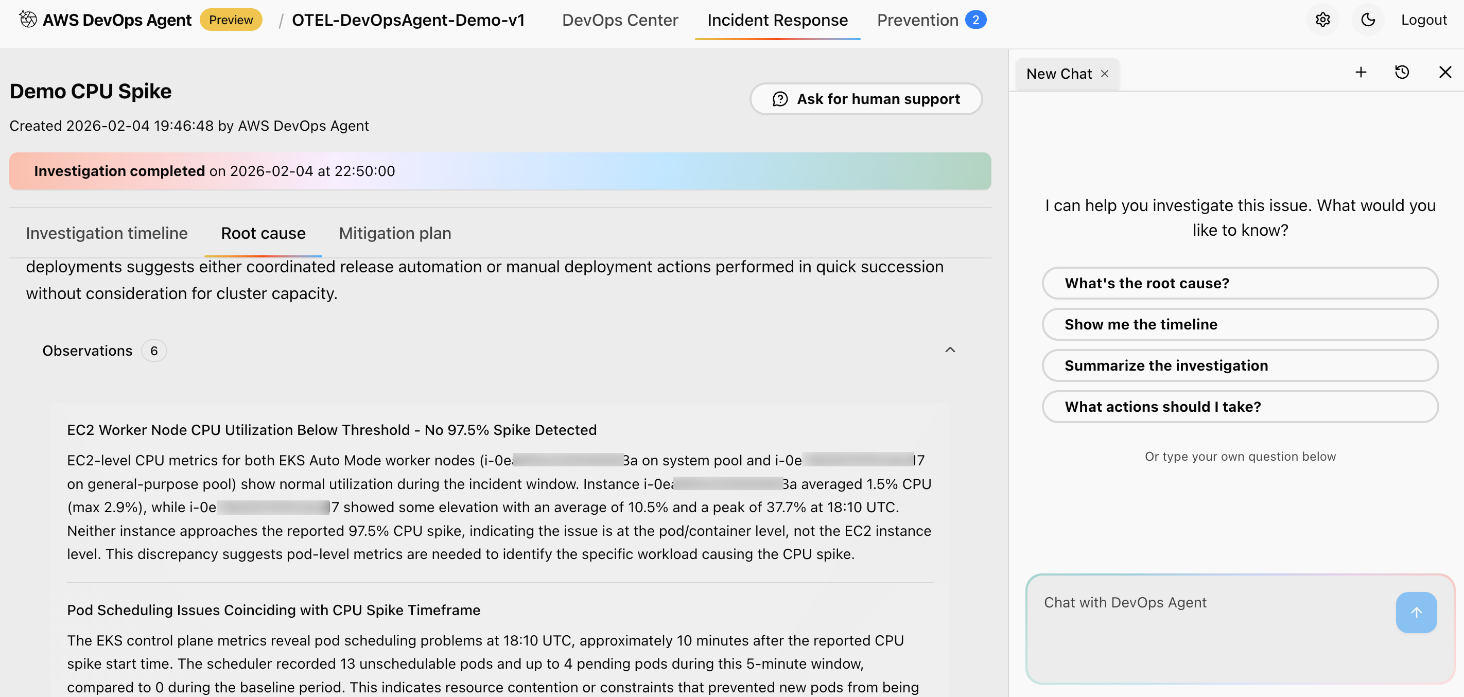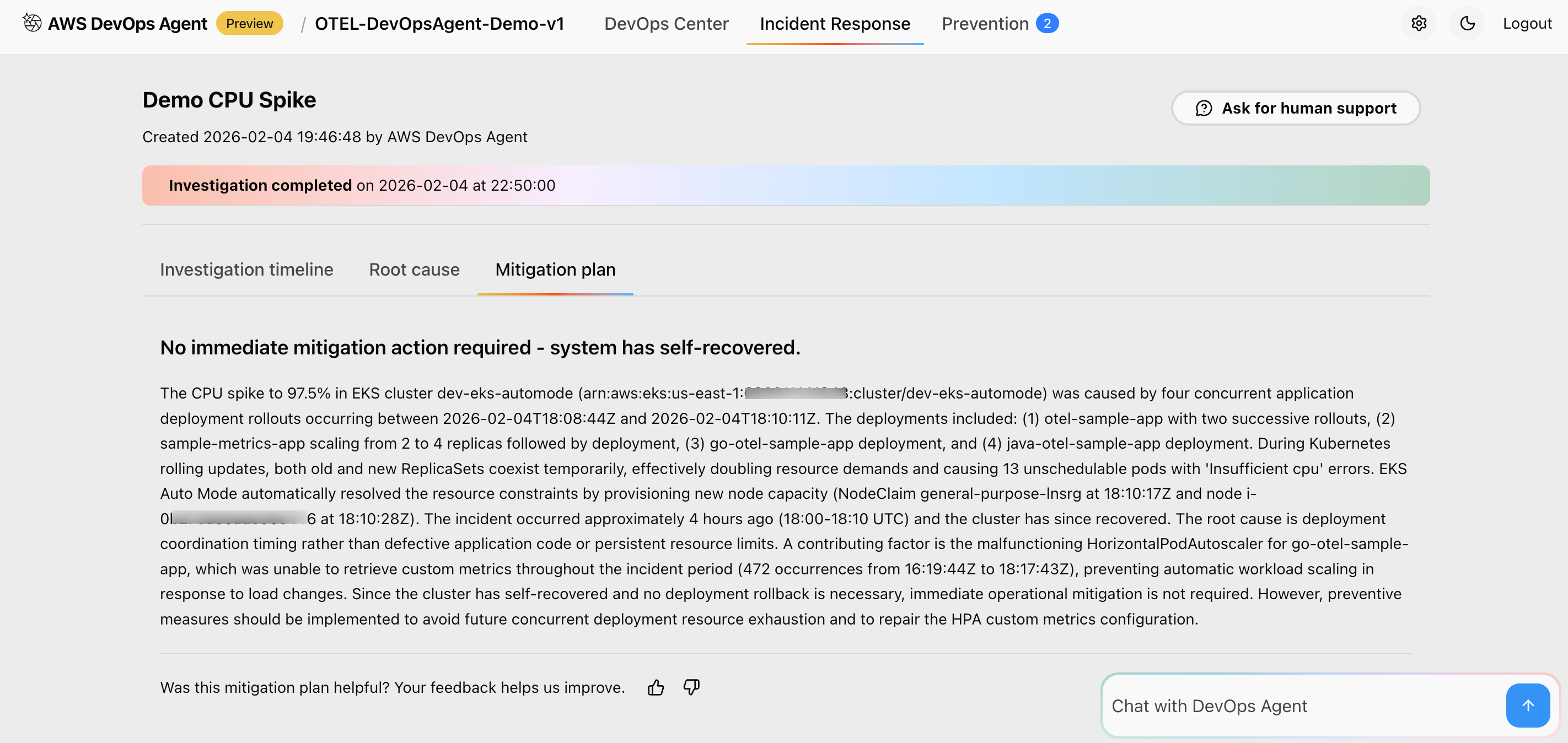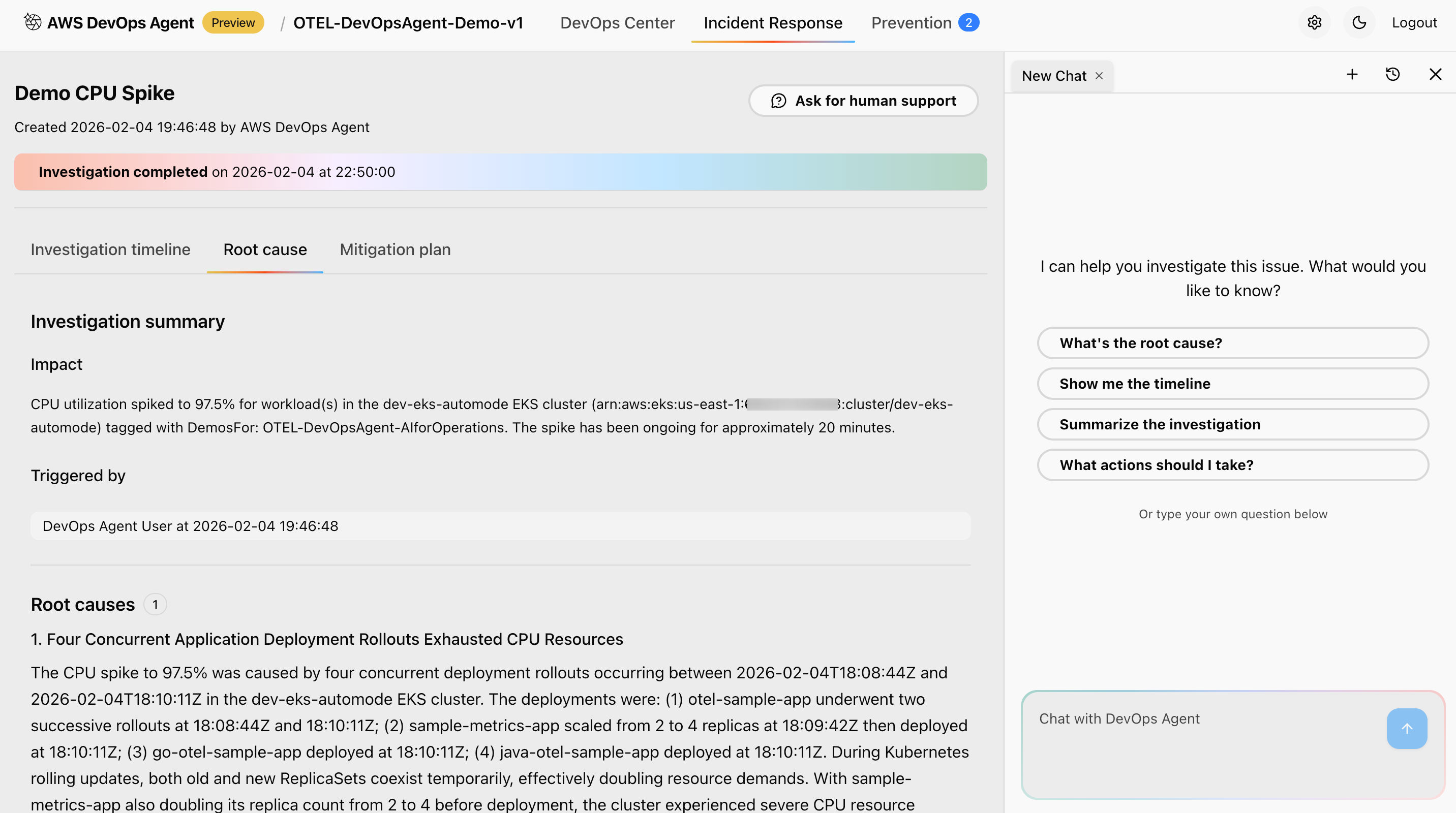 What you should observe: Once the test begins, the AWS DevOps Agent detects the deviation from the established baseline and initiates an investigation. In the agent’s incident response view, you will see the following outcomes: