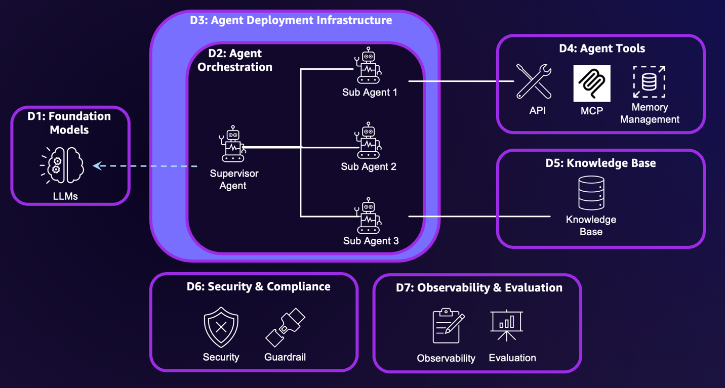 - Agent deployment infrastructure – The infrastructure encompasses the underlying hardware and system where agents run. The infrastructure options include using fully self-managed EC2 instances, managed services such as Amazon Elastic Container Services (Amazon ECS), and specialized managed services designed specifically for agent deployment, such as Amazon Bedrock AgentCore Runtime.