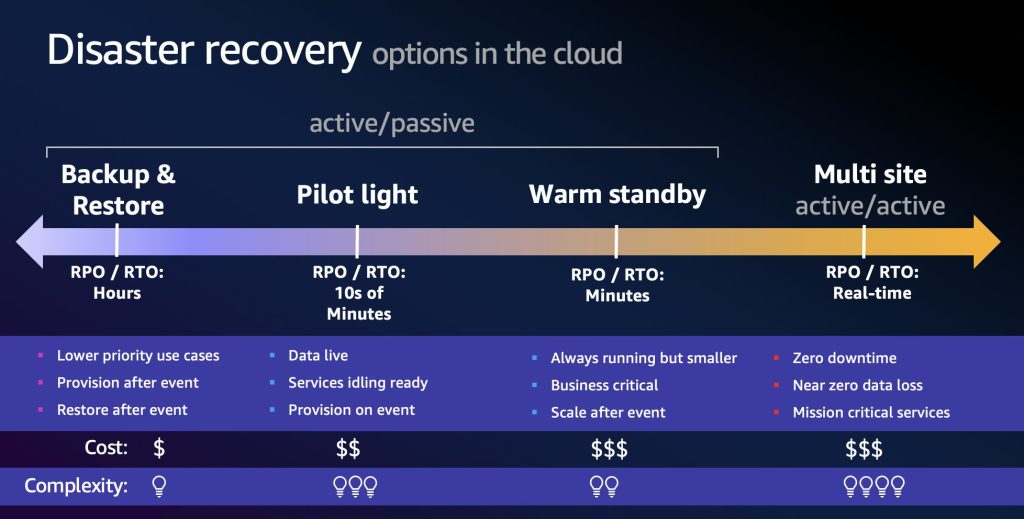 However, cross-partition connections increase operational complexity, security and compliance overhead, costs, and governance challenges. These factors make it important to implement such architectures only when they are truly required. Standard cloud resilience models range from simple backups to multi-site setups, and can be implemented across multiple Availability Zones as well as multiple Regions. The same concept equally applies across multiple partitions. We can move backups into a second partition to be able to recover into that partition. Equally we can run an application pilot light in another partition. This greatly reduces the cost of the infrastructure required in the second partition because it will only be built up when needed. Finally, warm standby or multi-site active-active setups mainly differ in the need for more complex network synchronization across partitions.