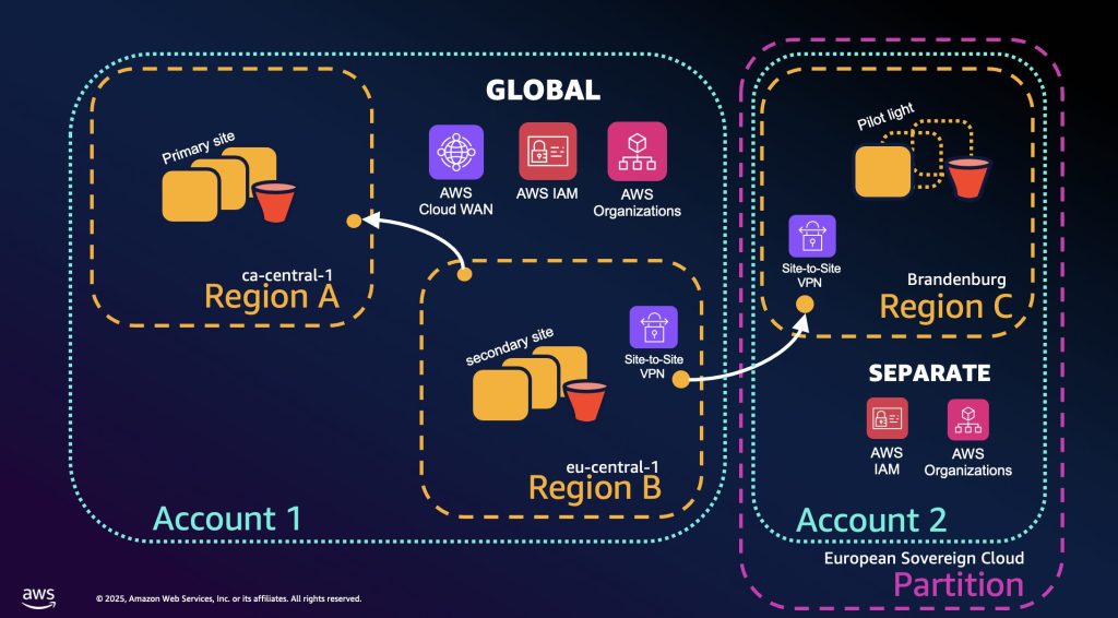 As regulatory requirements evolve, modern failover architectures must account for sovereign environments such as the AWS European Sovereign Cloud, AWS GovCloud (US), and multi-vendor deployments. This post focuses on three core areas for incorporating sovereignty requirements into failover design: failover strategy, network connectivity across isolated partitions, and authentication and authorization in cross-partition architectures. These patterns apply to both short regional outages and long-term partition failures.
