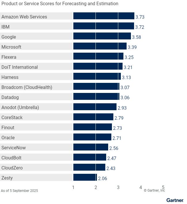 We observe that 2025 Gartner Critical Capabilities for Cloud Financial Management Tools research includes Cloud Service Providers (CSPs) alongside specialized solution providers for the first time. For this evaluation, Gartner assessed 17 vendors against 11 critical capabilities: Architectural Design Support, Cost Allocation, Cost Reporting, Unit Economics, Budget and Incident Management, Workload Optimization, Commitment Management, Remediation Management, KPI Tracking, Cloud Reselling, and Cloud Provider Support. These capabilities scores are weighted to feed into the top 7 use cases identified by Gartner: Financial Risk Management, Forecasting and Estimation, Driving Cost-Efficiency, Promoting Accountability, Maximizing Business Value, Solution Provider, and Multicloud Management.