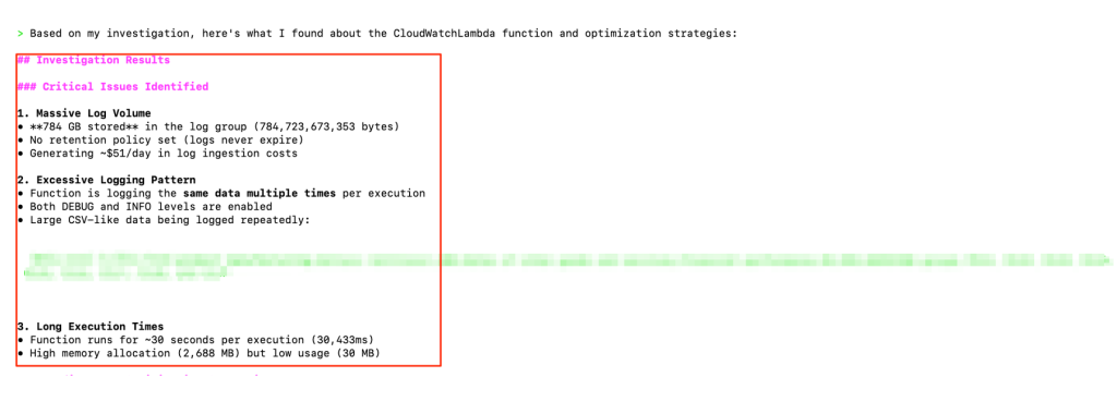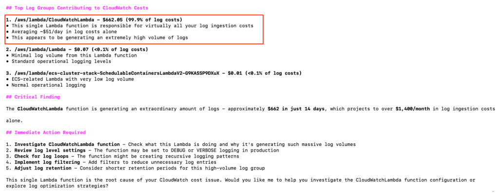 As shown in Figure 7 above, the analysis revealed that the CloudWatchLambda function is generating massive log costs due to excessive logging of repetitive CSV data at both DEBUG and INFO levels with no retention policy.