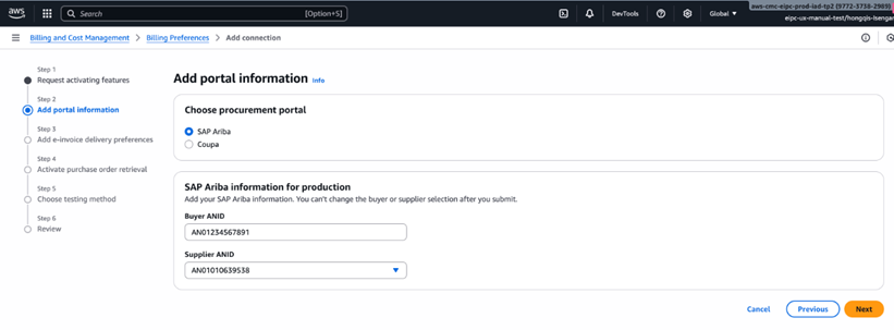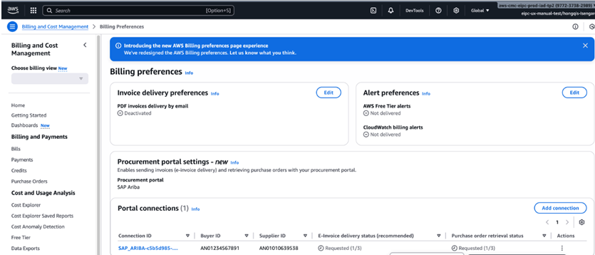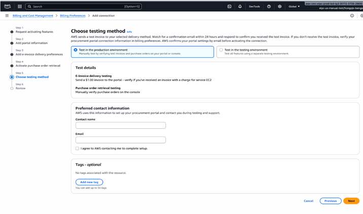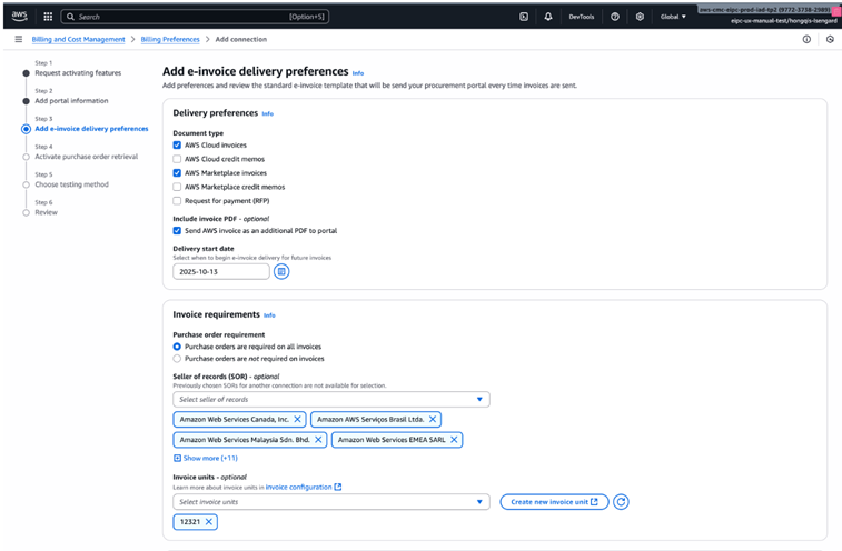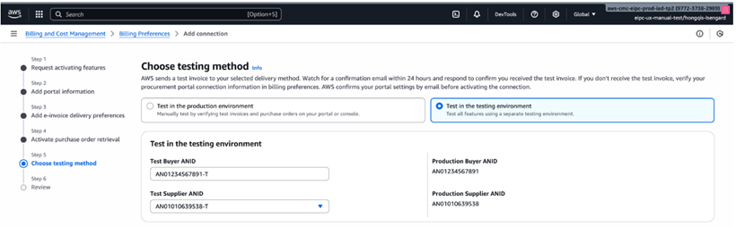 - Test environment: Enter the test environment details to send test invoices. AWS will send test invoices to the preferred test environment.