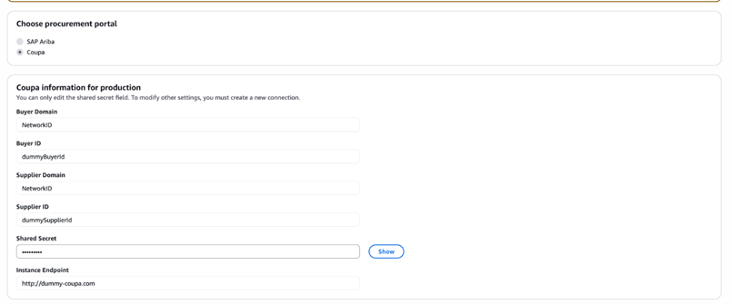 5. Choose your procurement portal and enter the procurement portal connection details (as shown on Figure 2 and Figure 3 for SAP Ariba and Coupa portals, respectively).
