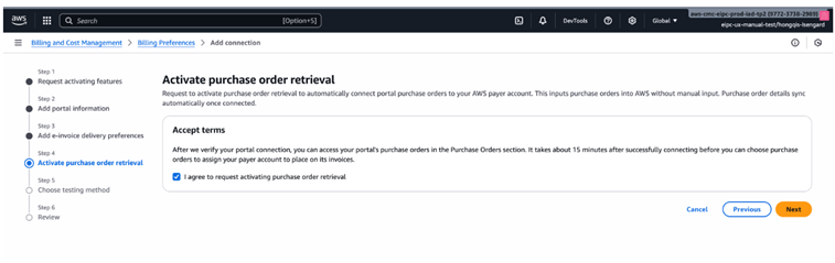 6. Accept the terms to retrieve purchase orders from your procurement portal. Upon activation (as shown in Figure 5), POs are retrieved from the procurement portal and will be available within 15 minutes in the Purchase Order section of AWS Billing and Cost Management console.