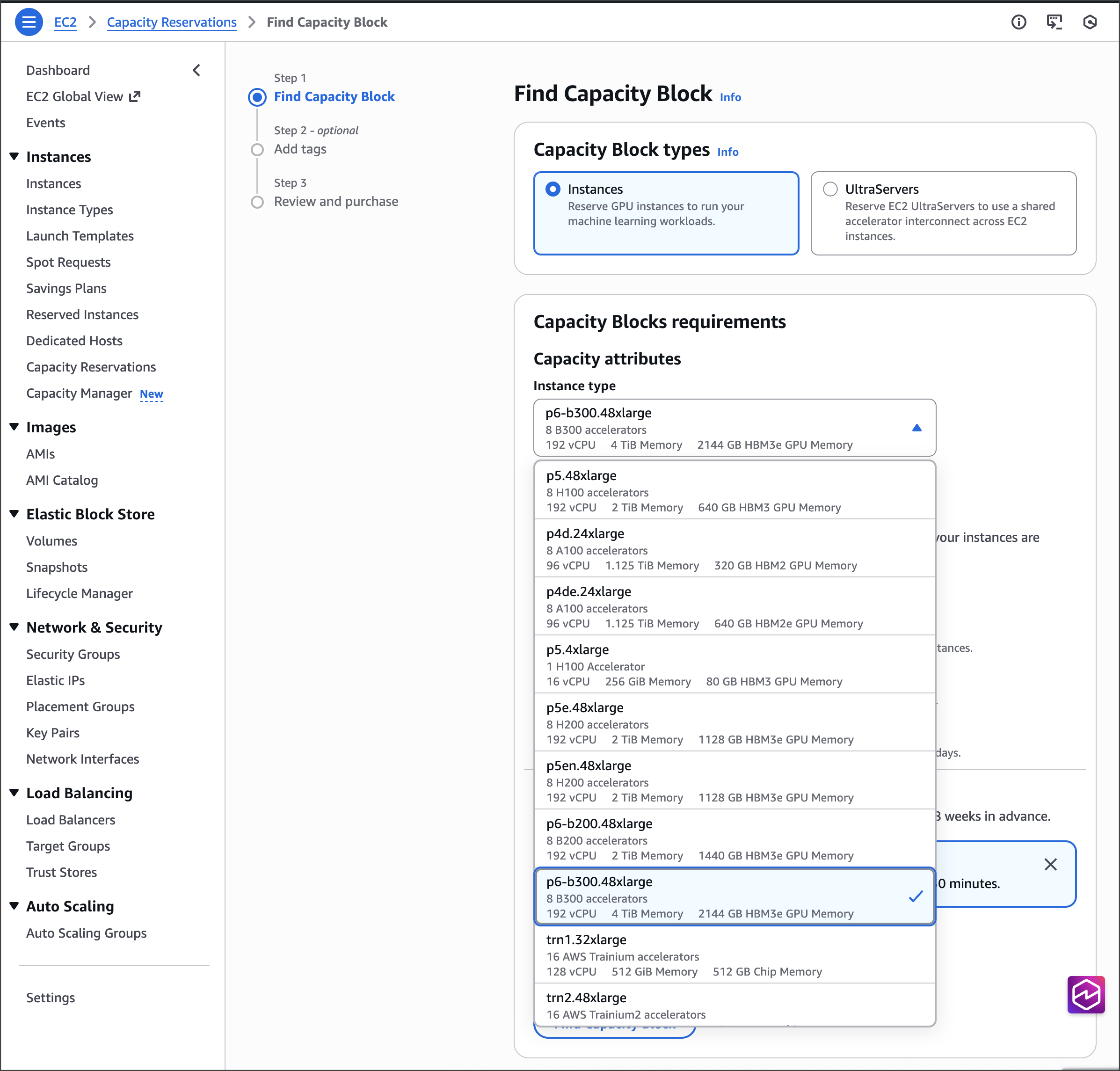 With these improvements, P6-B300 instances are ideal for training and serving large-scale AI models, particularly those employing sophisticated techniques such as Mixture of Experts (MoE) and multimodal processing. For organizations working with trillion-parameter models and requiring distributed training across thousands of GPUs, these instances provide the perfect balance of compute, memory, and networking capabilities.