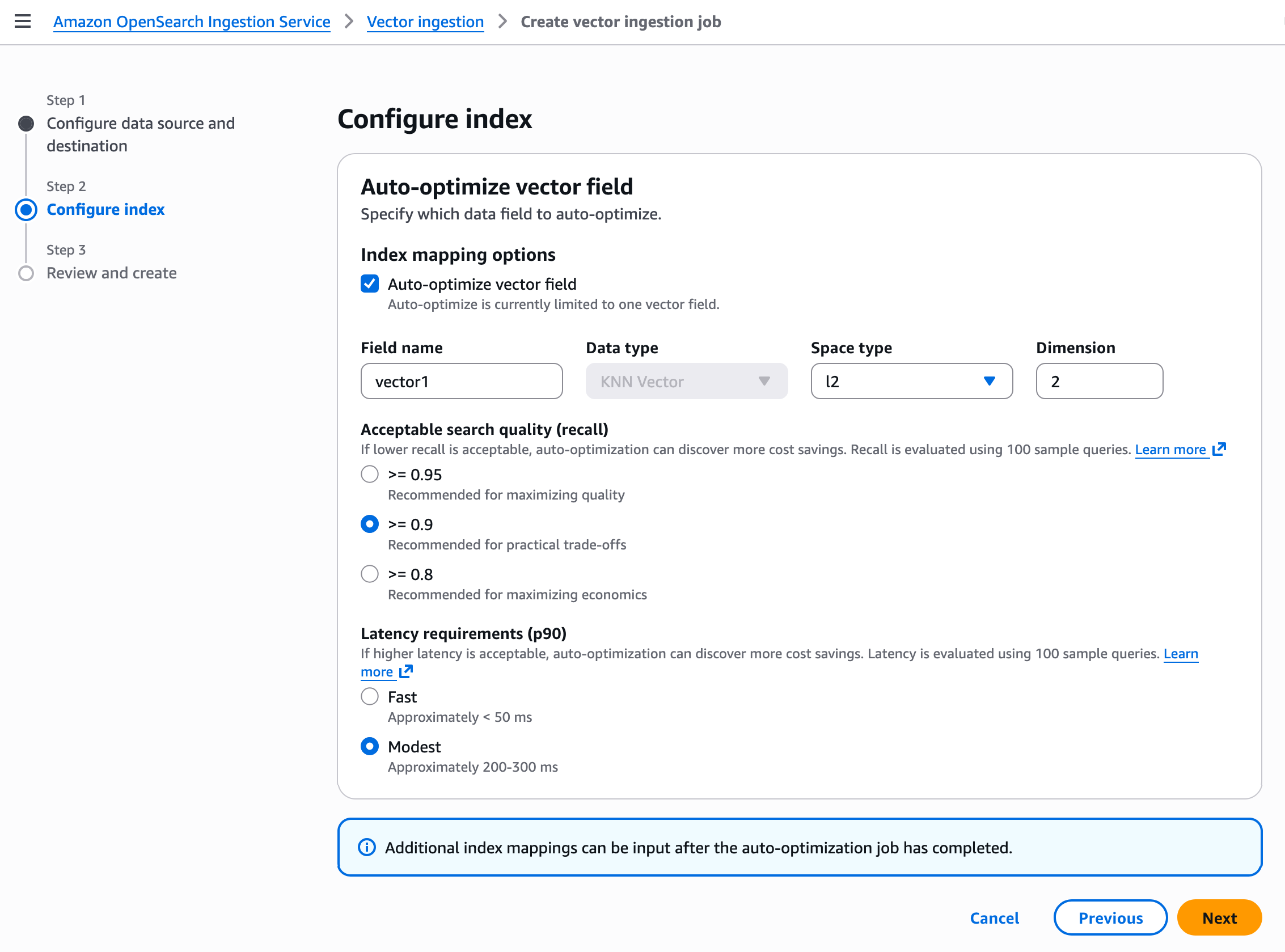 In Step 2, configure your vector index with auto-optimize vector field. Auto-optimize is currently limited to one vector field. Further index mappings can be input after the auto-optimization job has completed.