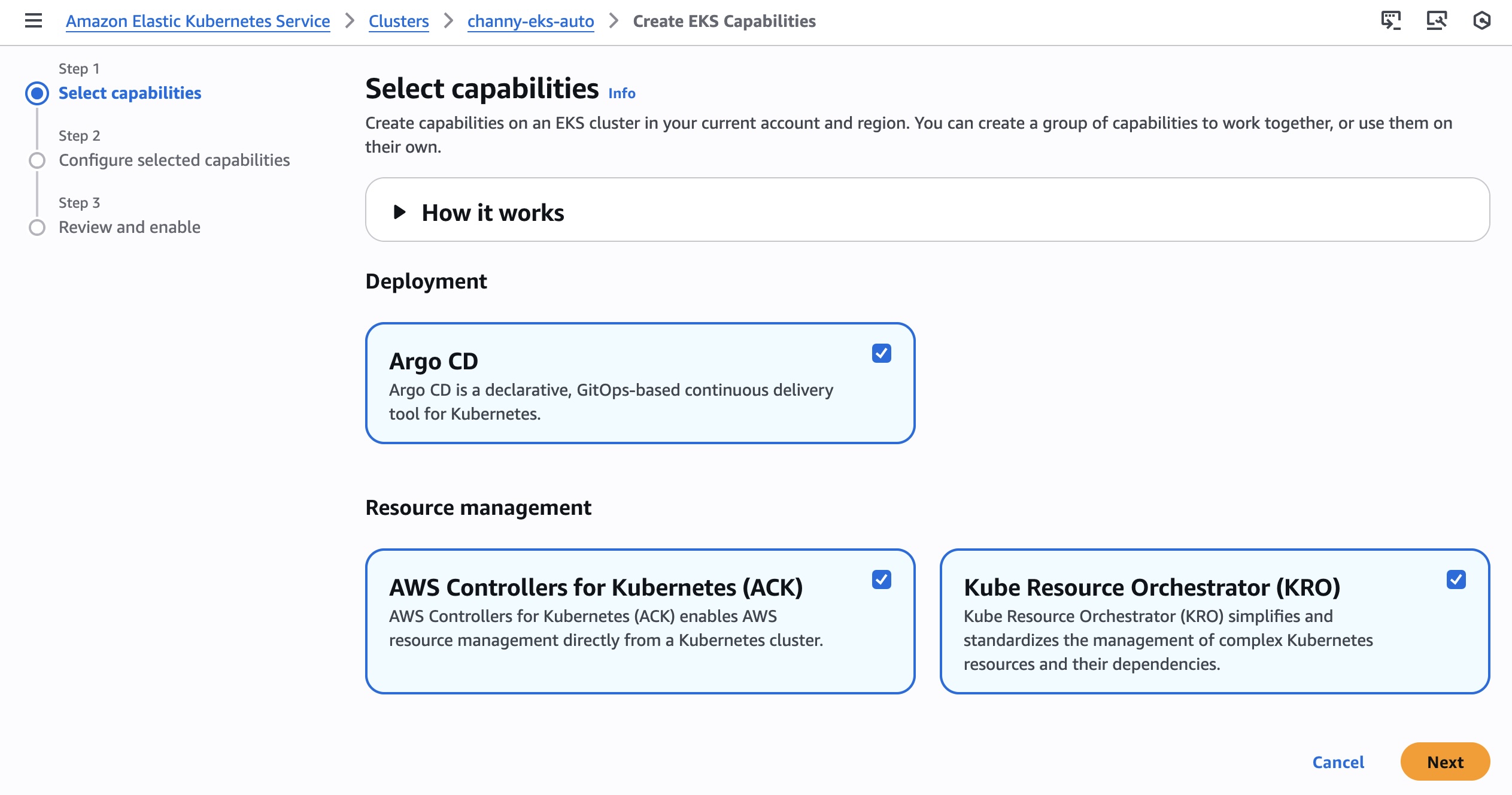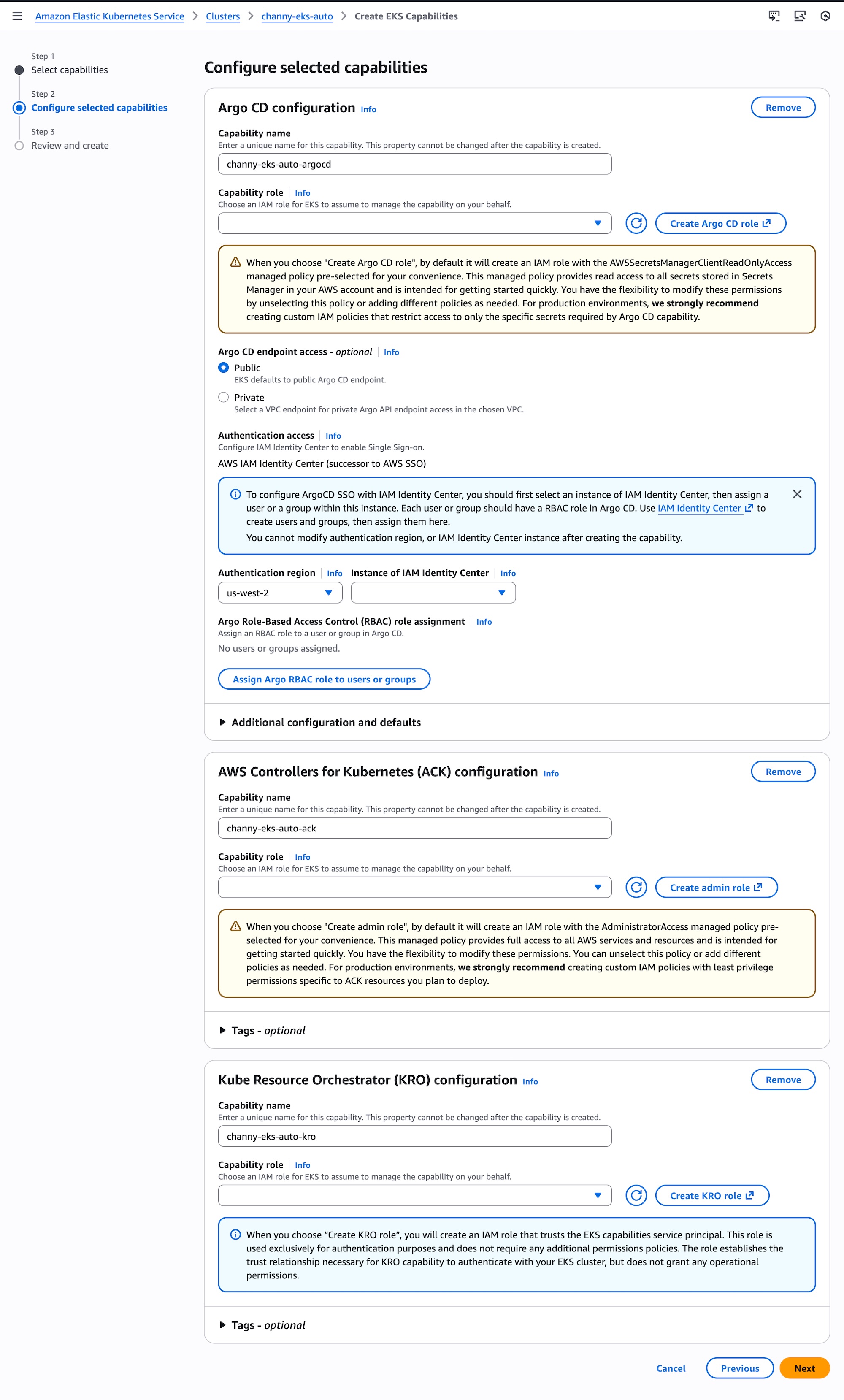 You can select one or more capabilities to work together. I checked all three capabilities: ArgoCD, ACK, and KRO. However, these capabilities are completely independent and you can pick and choose which capabilities you want enabled on your clusters.