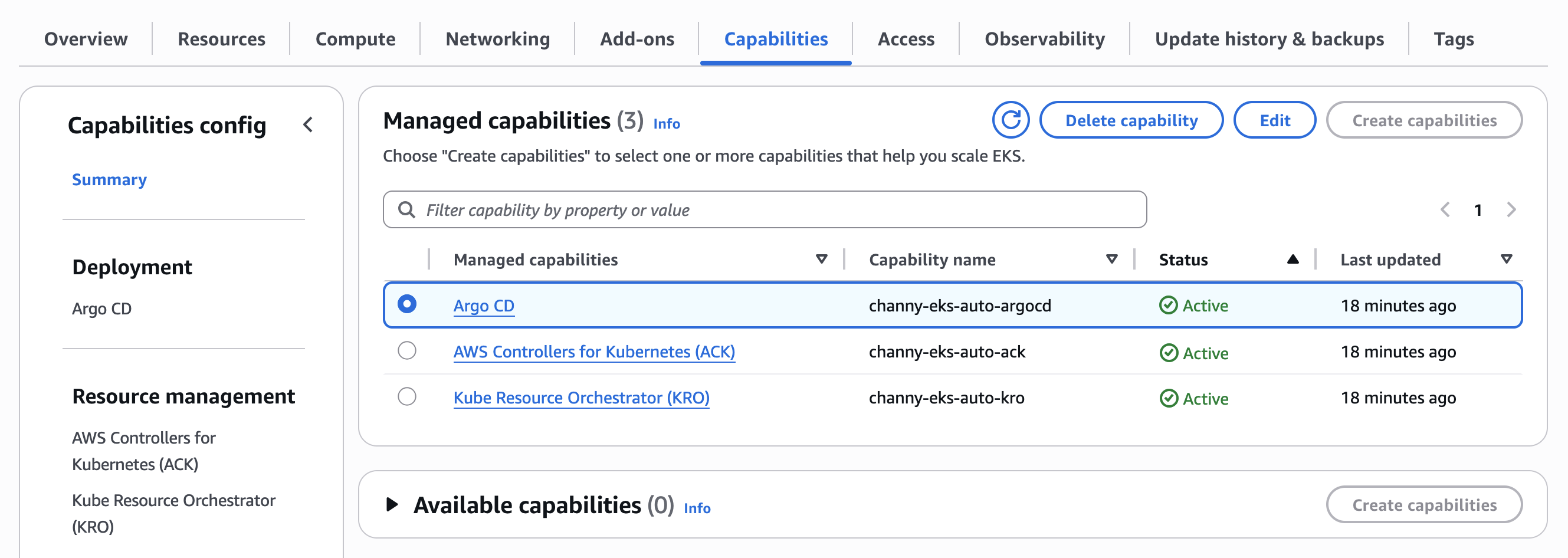 To enable EKS Capabilities, you can use the EKS console, AWS Command Line Interface (AWS CLI), eksctl, or other preferred tools. In the EKS console, choose Create capabilities in the Capabilities tab on your existing EKS cluster. EKS Capabilities are AWS resources, and they can be tagged, managed, and deleted.