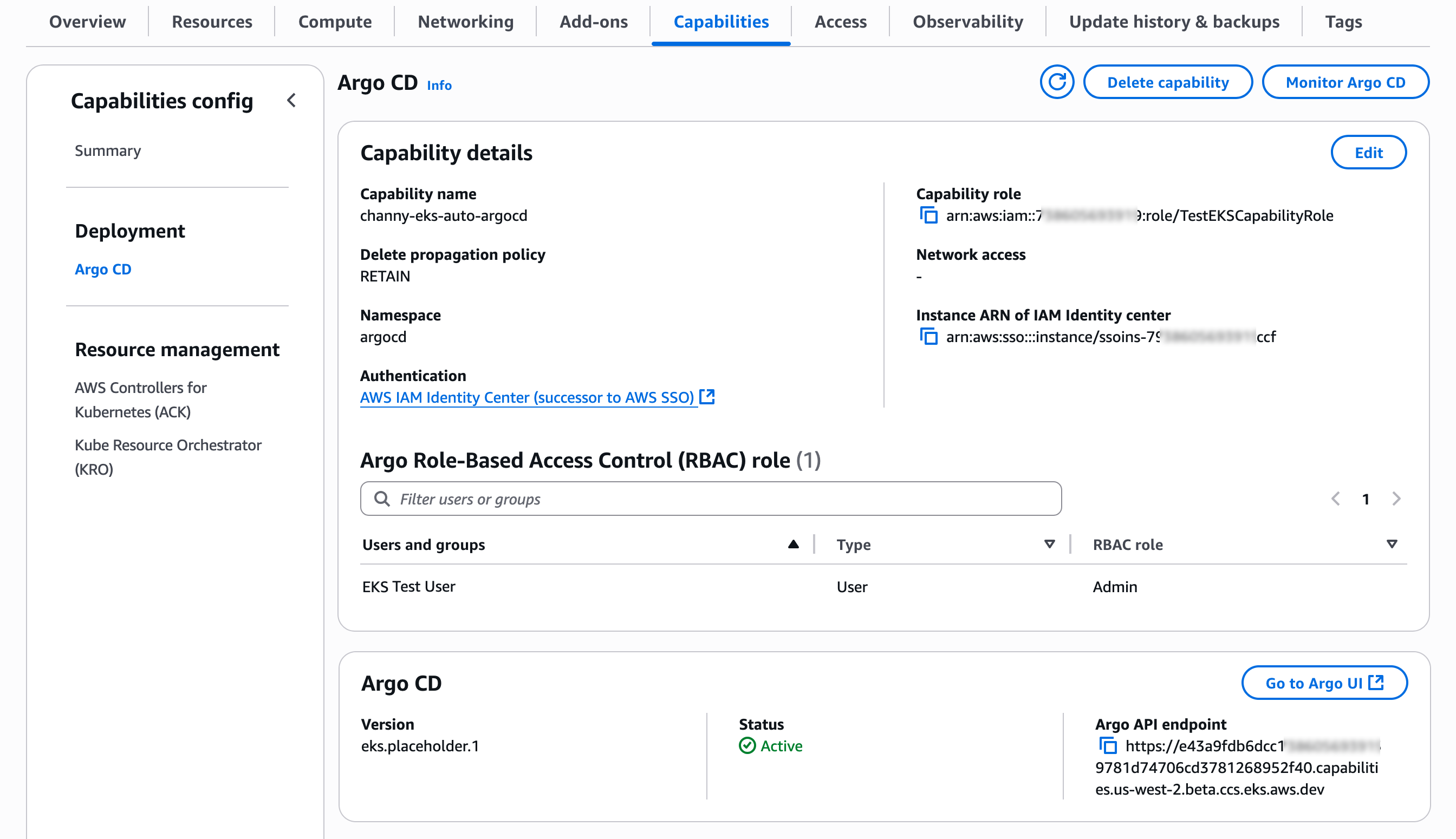 Now you can see and manage created capabilities. Select ArgoCD to update configuration of the capability.