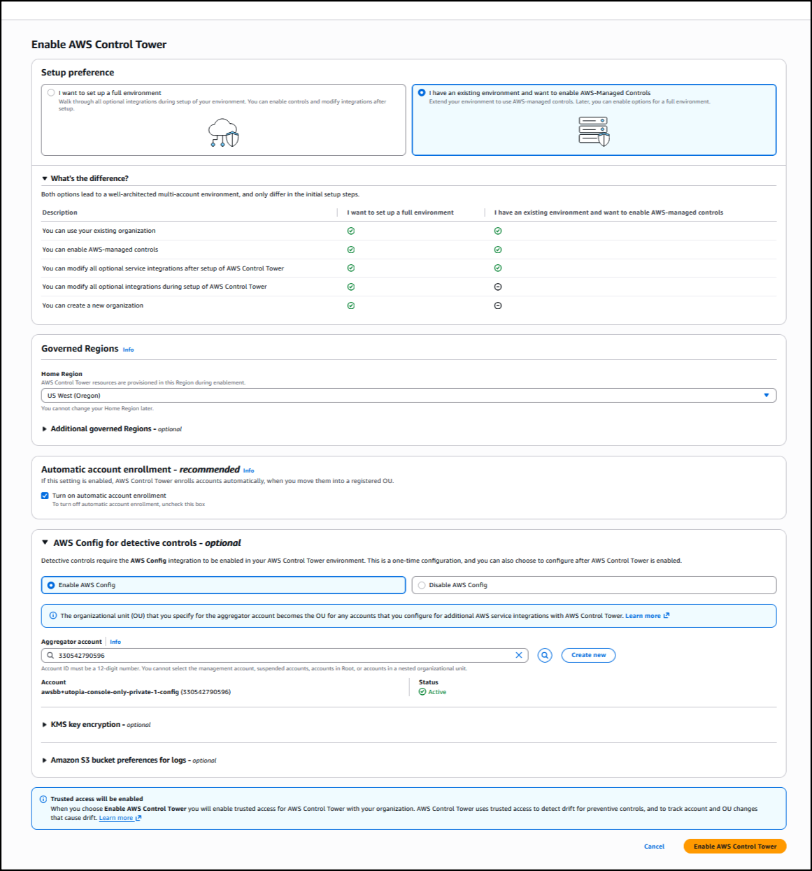 I have the option to set up a full environment, or only set up controls using the Controls Dedicated experience. I opt to set up controls by choosing I have an existing environment and want to enable AWS Managed Controls. Next, I set up the rest of the information, such as choosing the Home Region from the dropdown list so that AWS Control Tower resources are provisioned in this Region during enablement. I also select Turn on automatic account enrollment for AWS Control Tower to enroll accounts automatically when I move them into a registered organization unit. The rest of the information is optional; I choose Enable AWS Control Tower to finalize the process, and the landing zone setup begins.