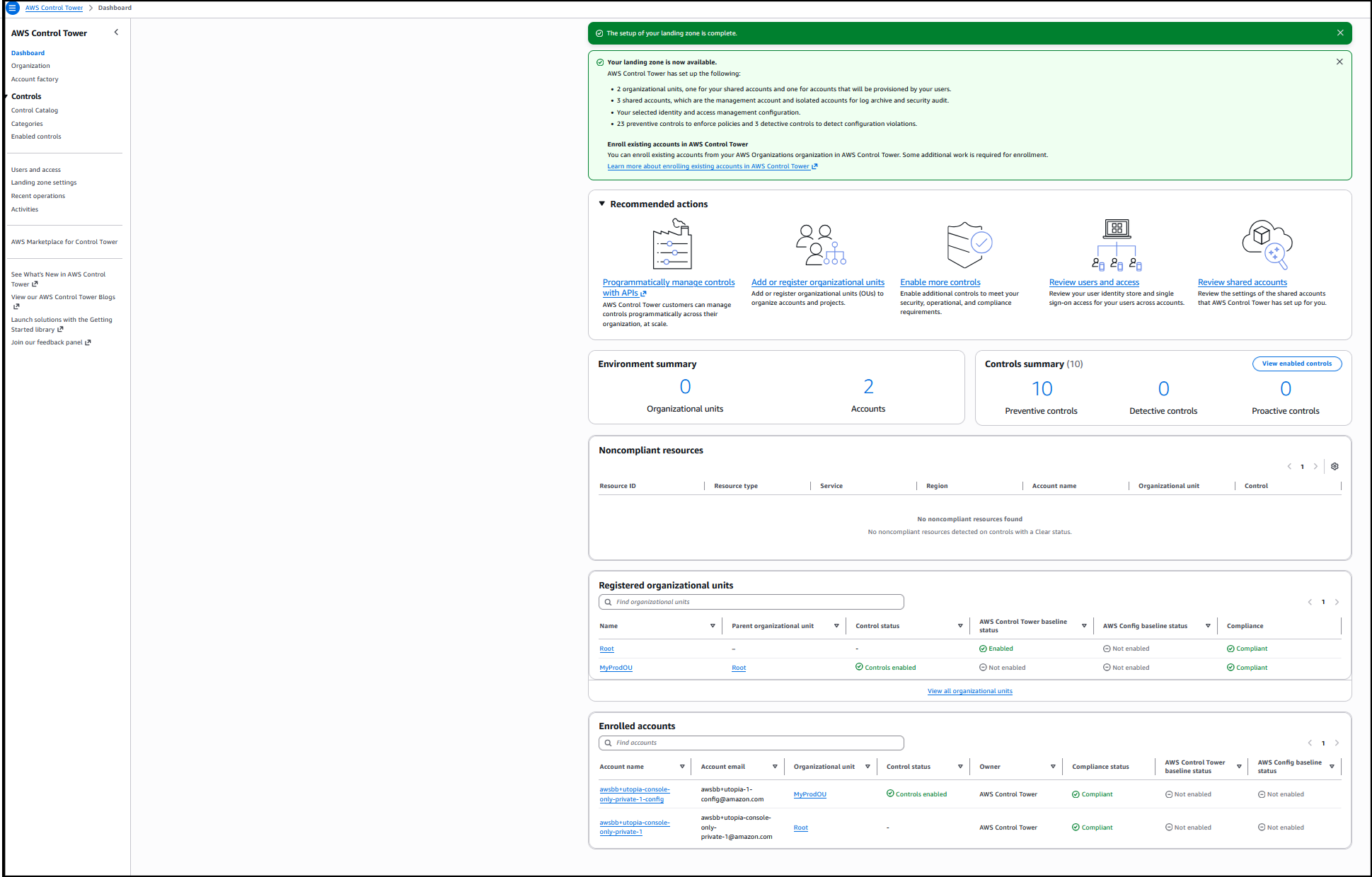 Behind the scenes, AWS Control Tower installed the required service-linked AWS Identity and Access Management (IAM) roles, and to use detective controls, service-linked Config Recorder in AWS Config in the account where I’m deploying the AWS managed controls. The setup is completed, and now I have all the infrastructure required to use the controls in this account. The dashboard gives a summary of the environment such as the organizational units that were created, the shared accounts, the selected IAM configuration, the preventive controls to enforce policies, and detective controls to detect configuration violations.