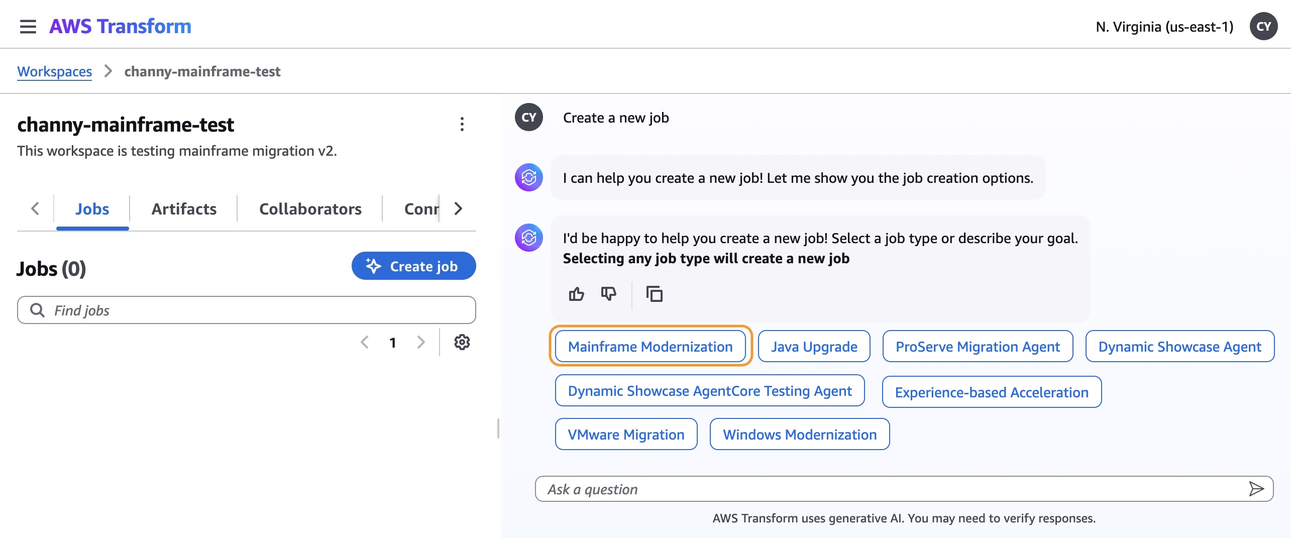 Choose Create job in your workspace. You can see all types of supported transformation jobs. For this example, I select the Mainframe Modernization job to modernize mainframe applications.
