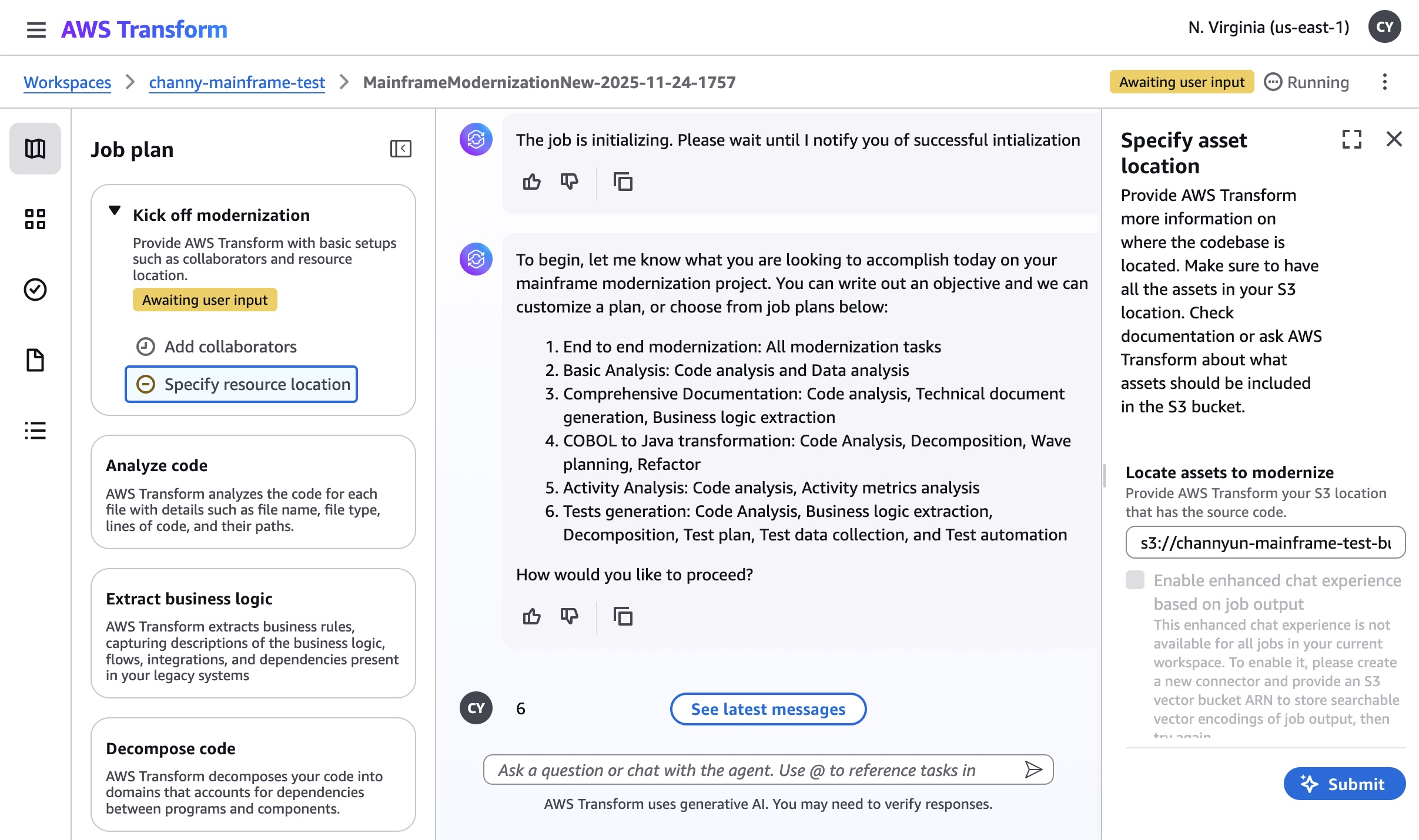 After a new job is created, you can kick off modernization for tests generation. This workflow is sequential and it is a place for you to answer the AI agent’s questions, providing the necessary input. You can add your collaborators and specify resource location where the codebase or documentation is located in your Amazon Simple Storage Service (Amazon S3) bucket.