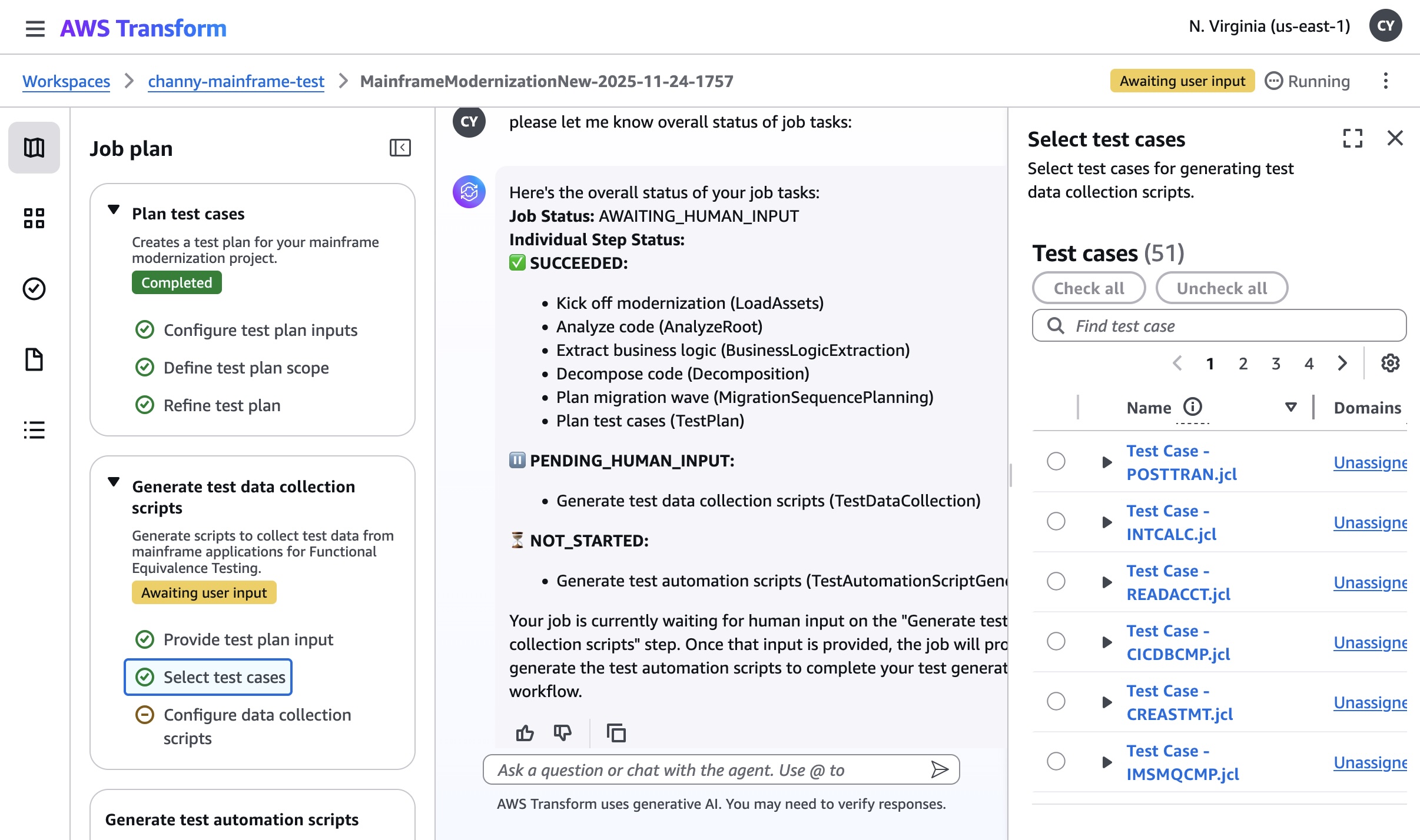 - Automated testing – Customers can use new automated test plan generation, test data collection scripts, and test case automation scripts. AWS Transform for mainframe also provides functional testing tools for data migration, results validation, and terminal connectivity. These AI-powered capabilities work together to accelerate testing timelines and improve accuracy through automation.