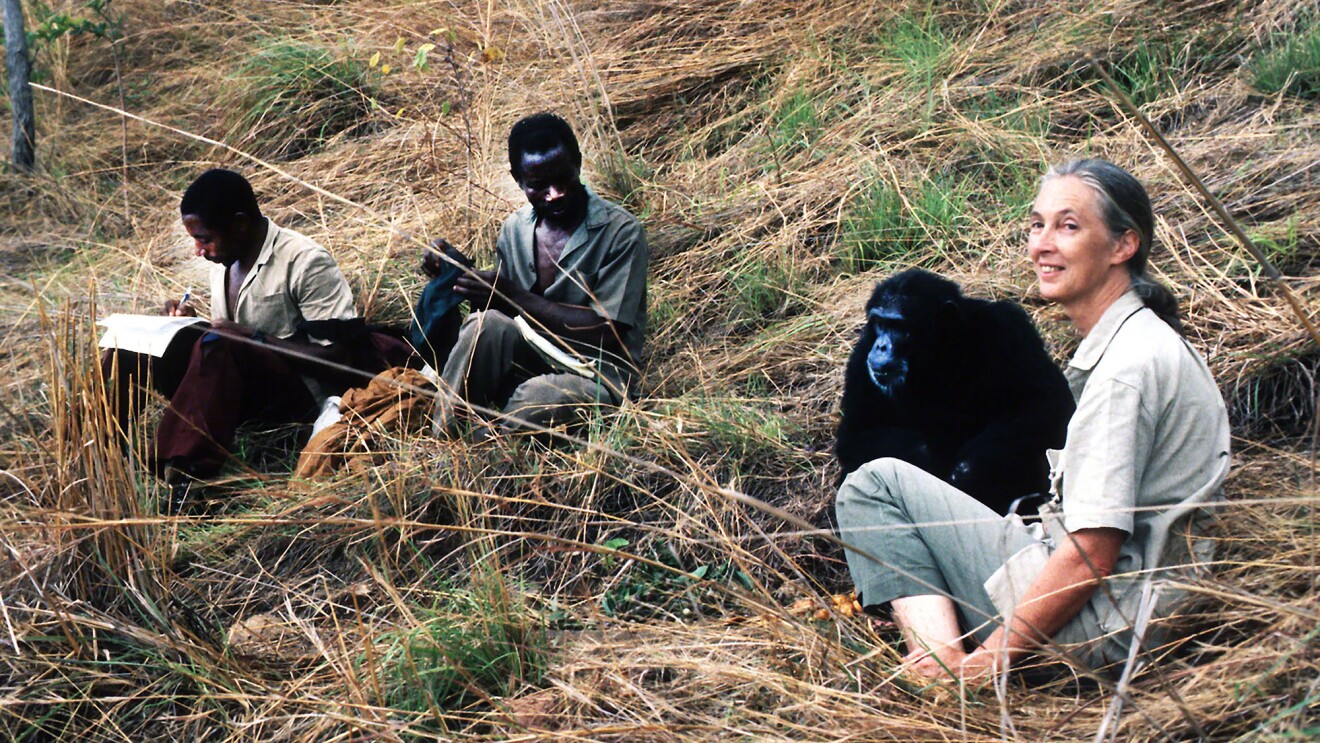 Transforming decades of research through cloud and AI. Dr. Jane Goodall and field staff observe Goblin at Gombe National Park, Tanzania. CREDIT: the Jane Goodall Institute