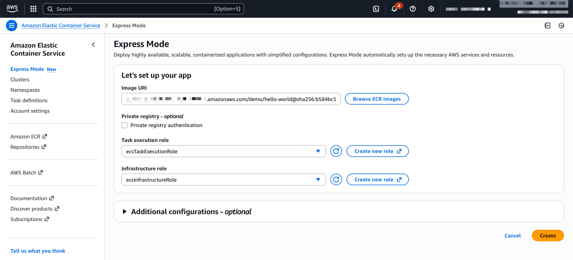 Get started with Amazon ECS Express Mode through the Amazon ECS console. Learn more on the Amazon ECS documentation page.