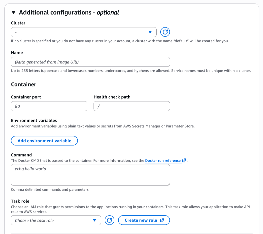 If I want to customize the deployment, I can expand the Additional configurations section to define my cluster, container port, health check path, or environment variables.