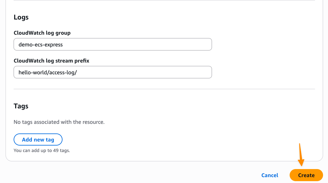Setting up logs in Amazon CloudWatch Logs is something I always configure so I can troubleshoot my applications if needed. When I’m happy with the configurations, I choose Create.