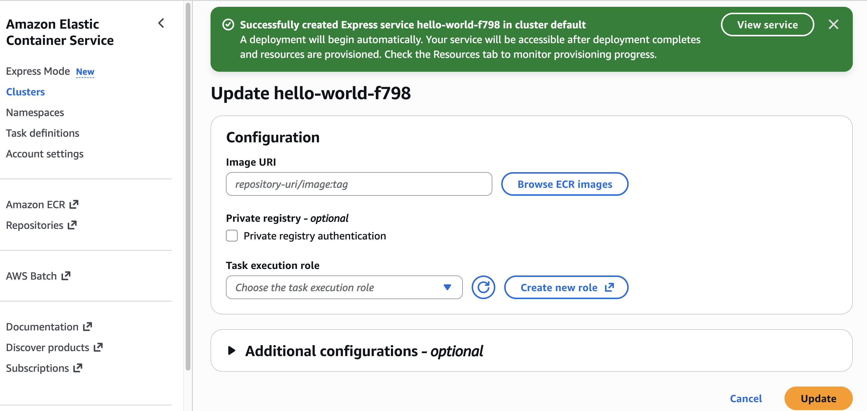 When I need to update my application with a new container version, I can return to the console, select my Express service, and choose Update. I can use the interface to specify a new image URI or adjust resource allocations.
