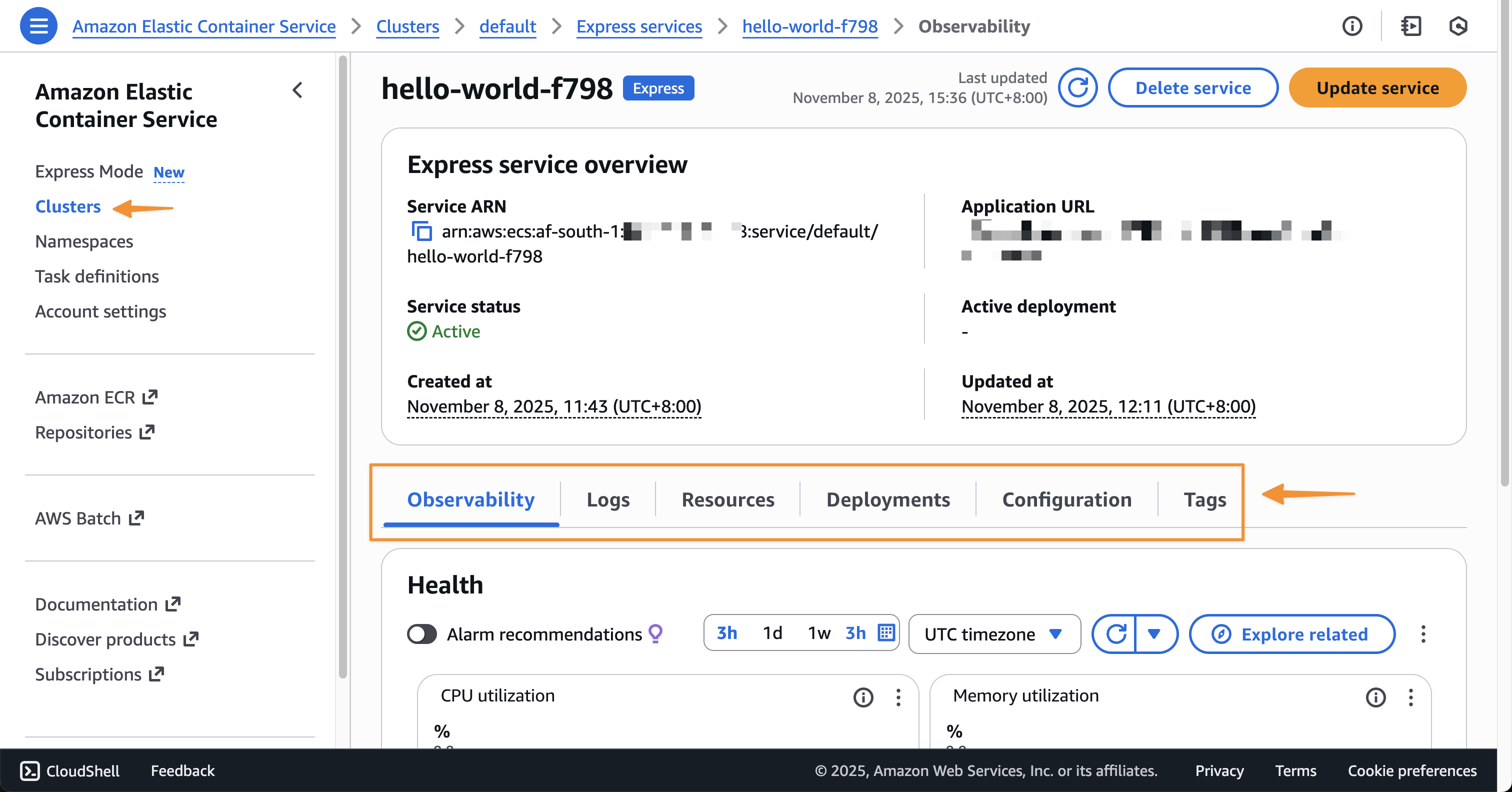 After the application is created, I can see the details by visiting the specified cluster, or the default cluster if I didn’t specify one, in the ECS service to monitor performance, view logs, and manage the deployment.