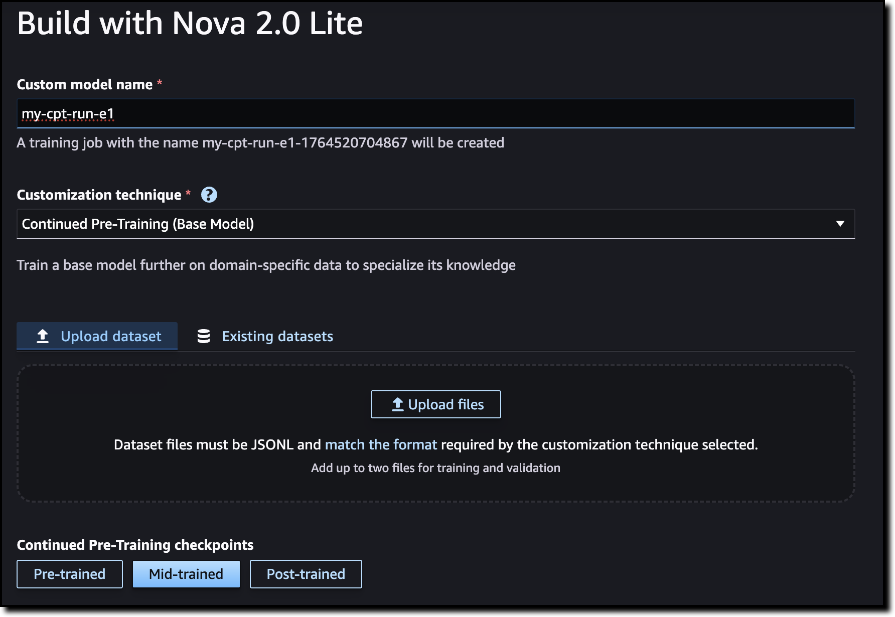 To start building the model, choose which checkpoint to use: pre-trained, mid-trained, or post-trained. You can also upload your dataset here or use existing datasets.