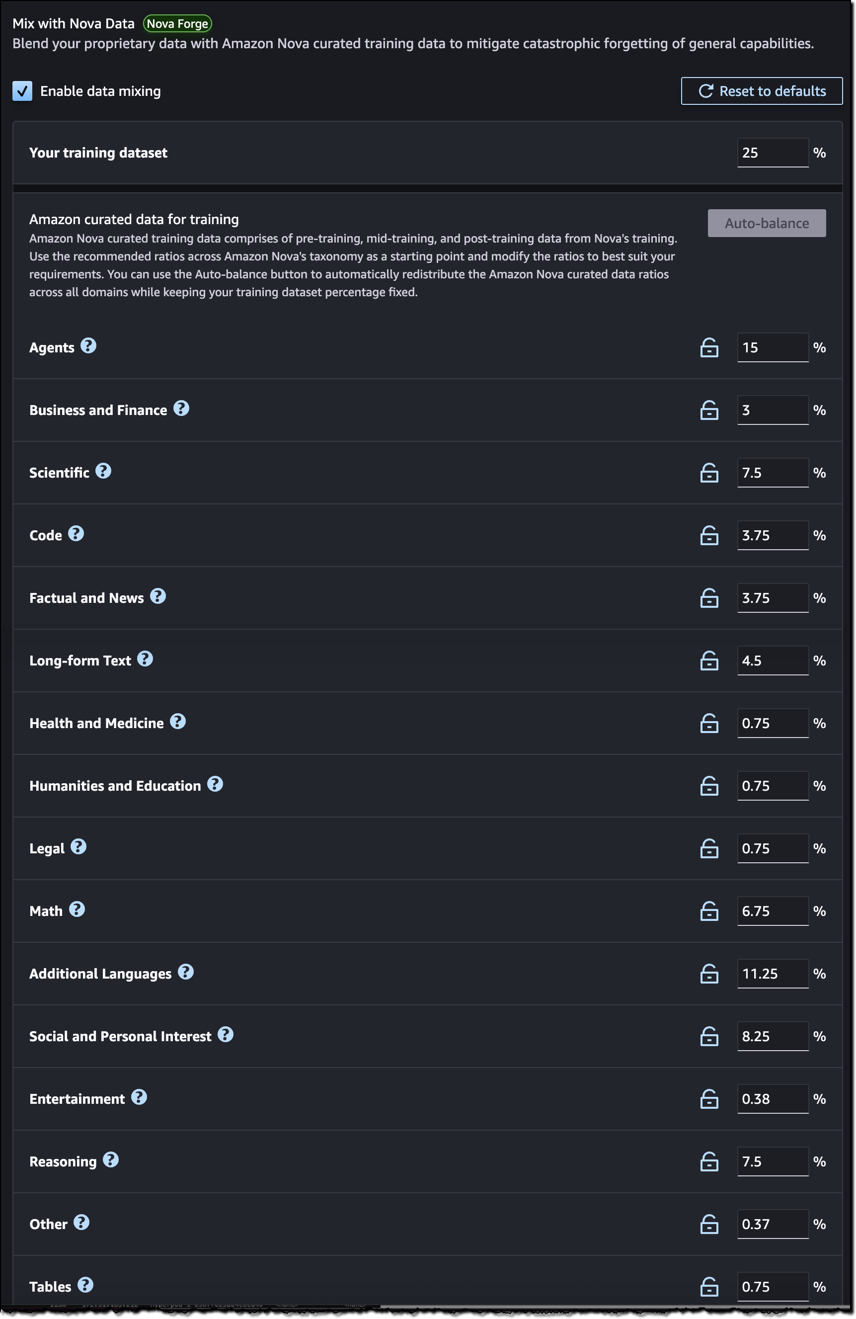 You can blend your training data by mixing in curated datasets provided by Nova. These datasets, categorized by domain, can help your model to preserve general performance and prevent overfitting or catastrophic forgetting.