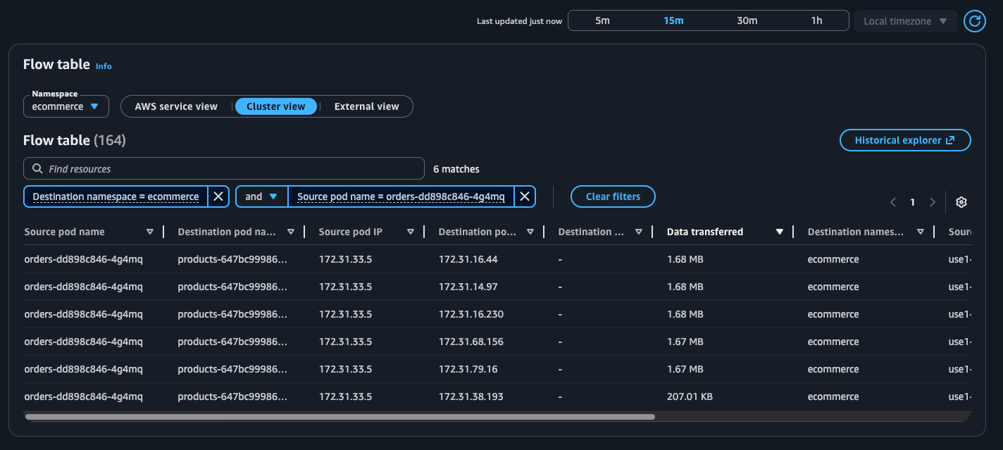 The filtering capabilities are useful for troubleshooting, for example, to focus on traffic from a specific orders pod. This granular filtering helps you quickly isolate communication patterns when investigating performance issues. For instance, if customers are experiencing slow checkout times, you can filter to see if the orders service is making too many calls to the products service, or if there are network bottlenecks between specific pod instances.