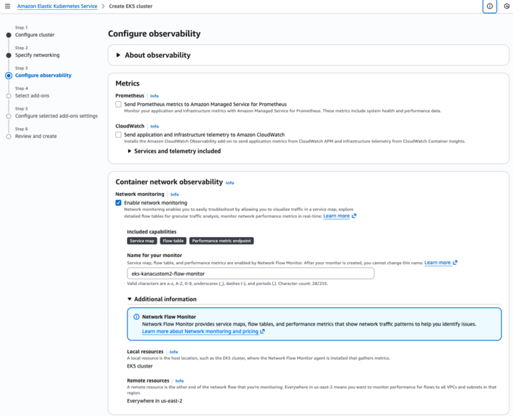 - Availability – Container Network Observability in EKS is available in all commercial AWS regions where Amazon CloudWatch Network Flow Monitor is available.