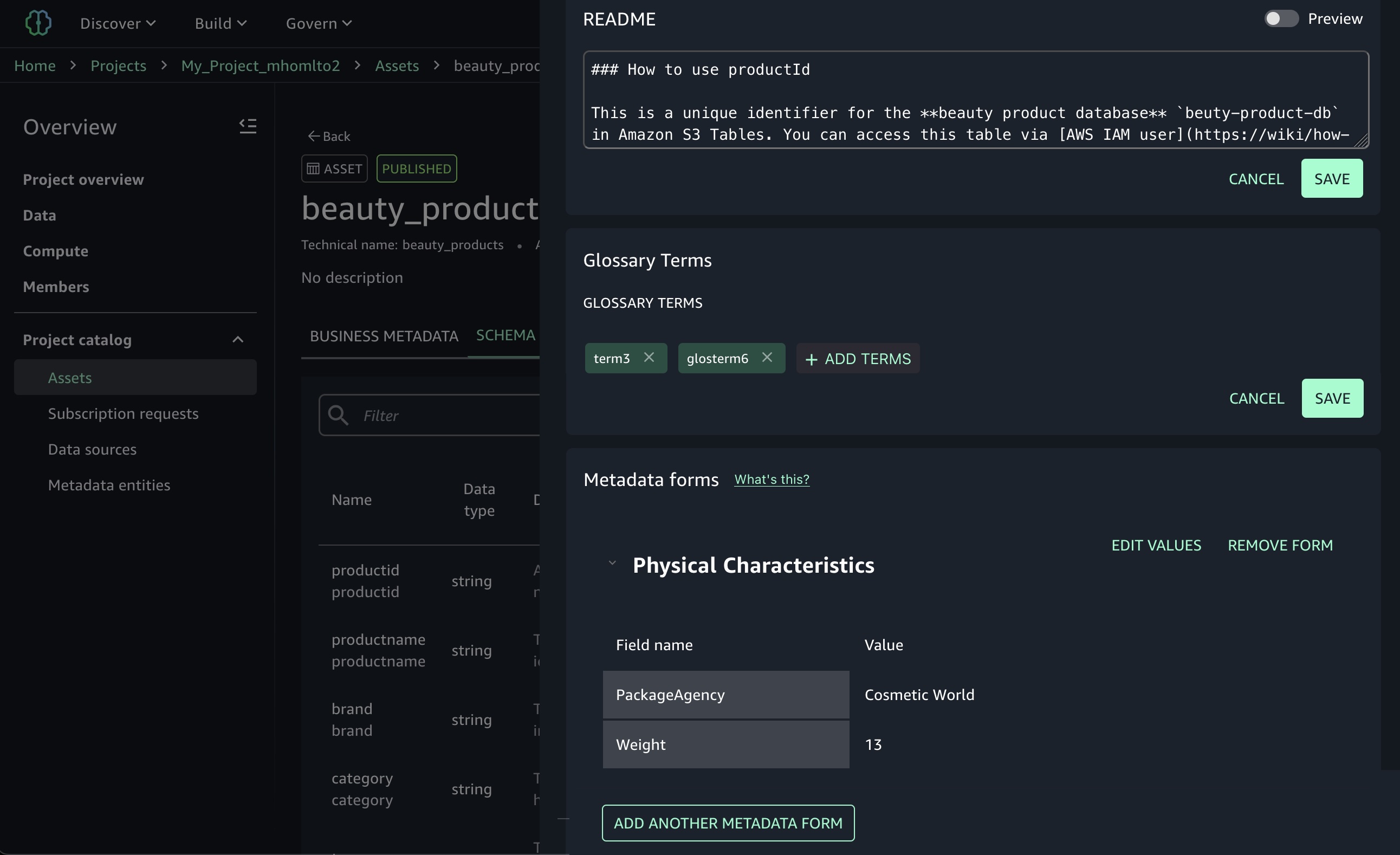 - Column-level metadata forms and rich descriptions – You can create custom metadata forms to capture business-specific information directly in individual columns. Columns also support markdown-enabled rich text descriptions for comprehensive data documentation and business context.