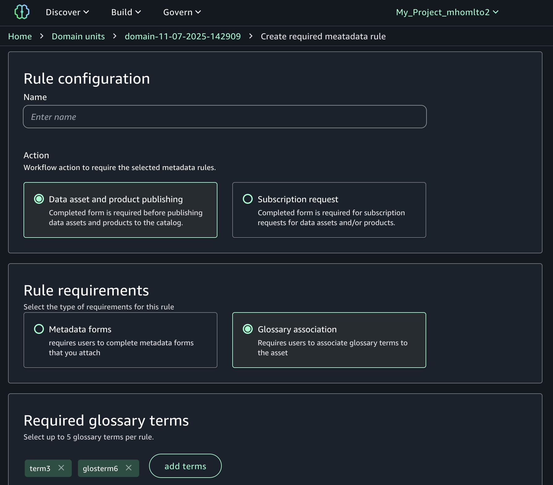 - Enforce metadata rules for glossary terms for asset publishing – You can use metadata enforcement rules for glossary terms, meaning data producers must use approved business vocabulary when publishing assets. By standardizing metadata practices, your organization can improve compliance, enhance audit readiness, and streamline access workflows for greater efficiency and control.