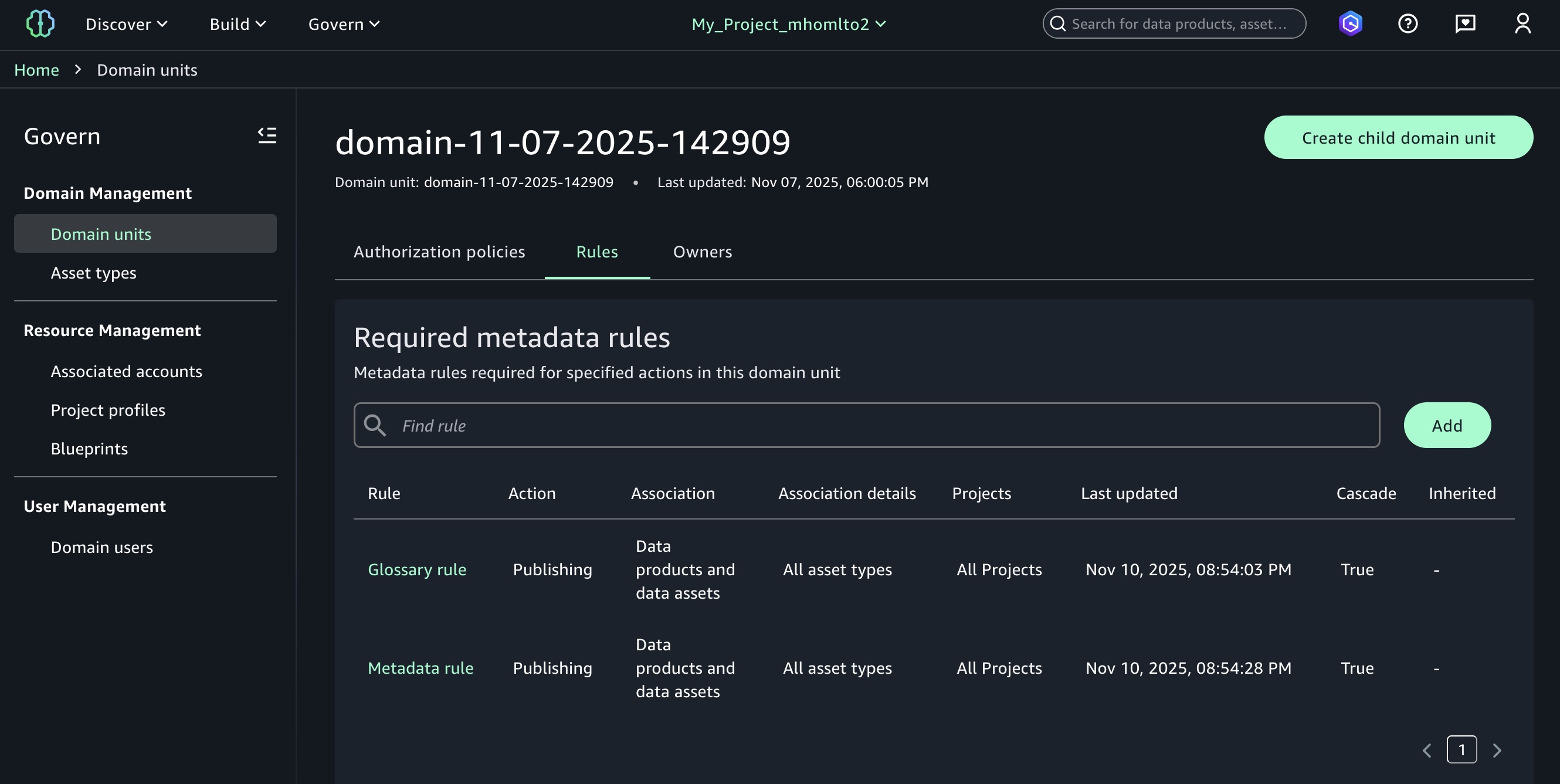 To enable a new metadata rule for glossary terms, choose Add in your domain units under the Domain Management section in the Govern menu.