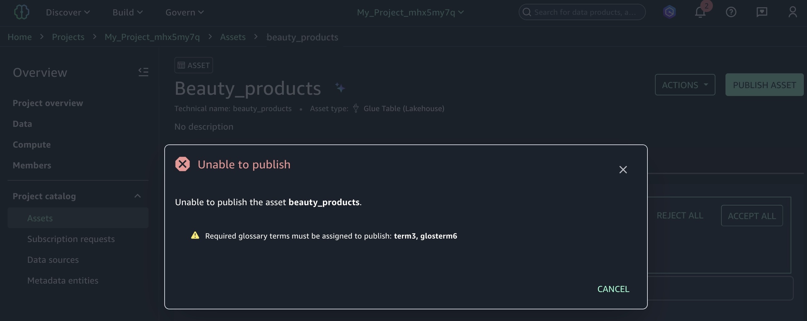 If you attempt to publish assets without adding the required glossary terms, the error message prompting you to enforce the glossary rule appears.