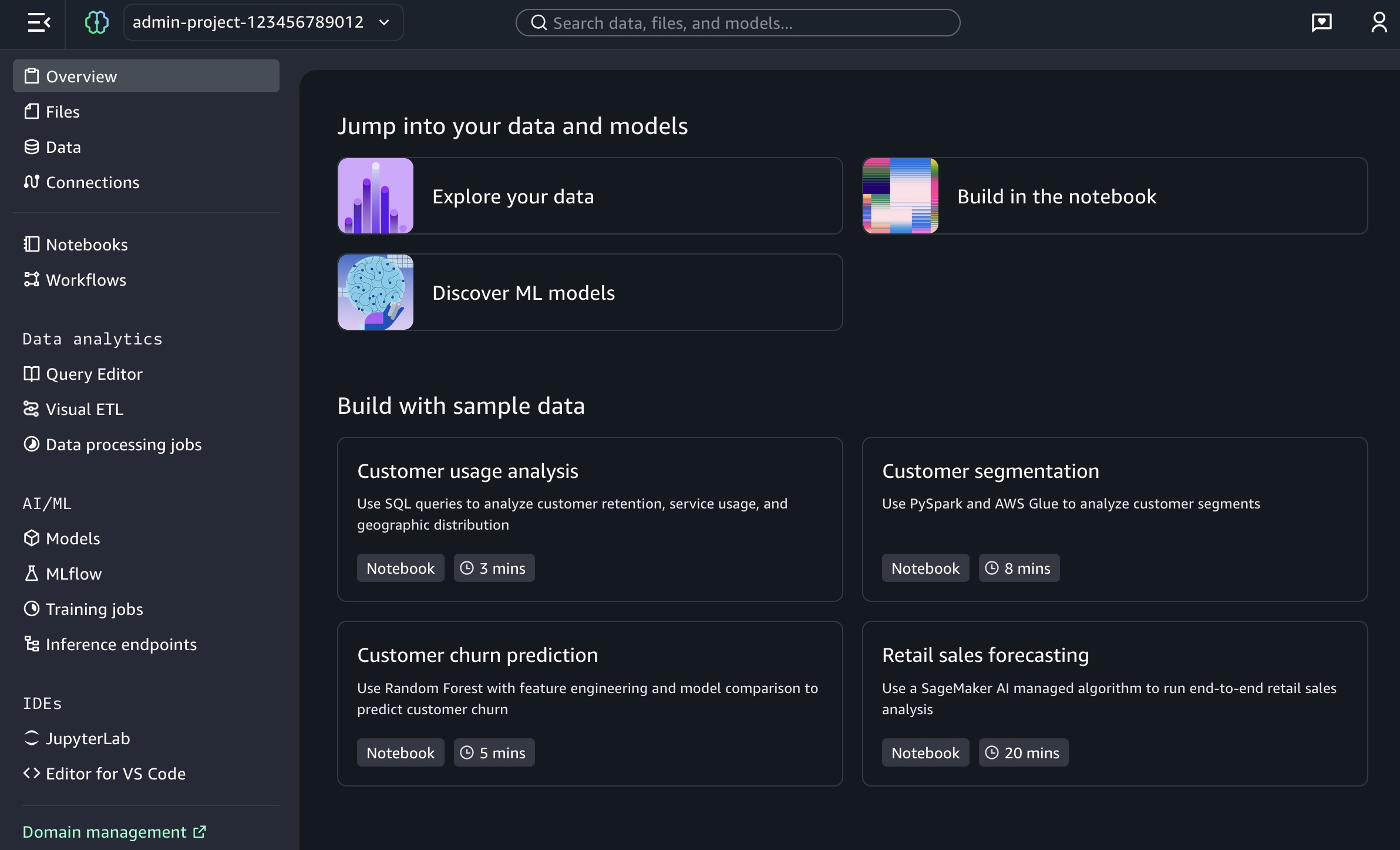 To start a new notebook, choose the Notebooks menu in the left navigation pane to run SQL queries, Python code, and natural language, and to discover, transform, analyze, visualize, and share insights on data. You can get started with sample data such as customer analytics and retail sales forecasting.