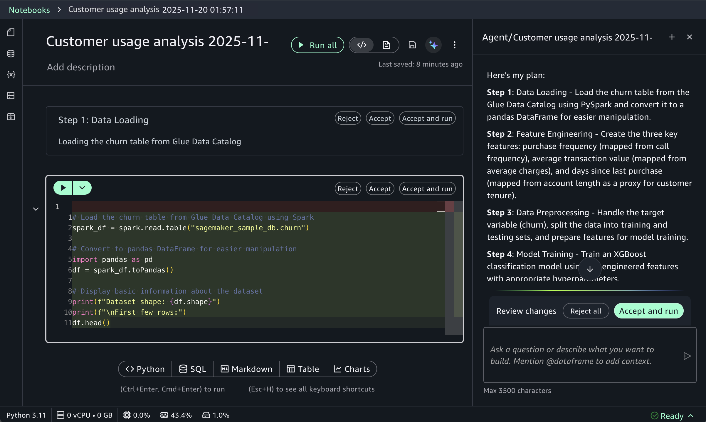 Amazon SageMaker is introducing a new notebook experience that provides data and AI teams with a high-performance, serverless programming environment for analytics and ML jobs. The new notebook experience includes Amazon SageMaker Data Agent, a built-in AI agent that accelerates development by generating code and SQL statements from natural language prompts while guiding users through their tasks.