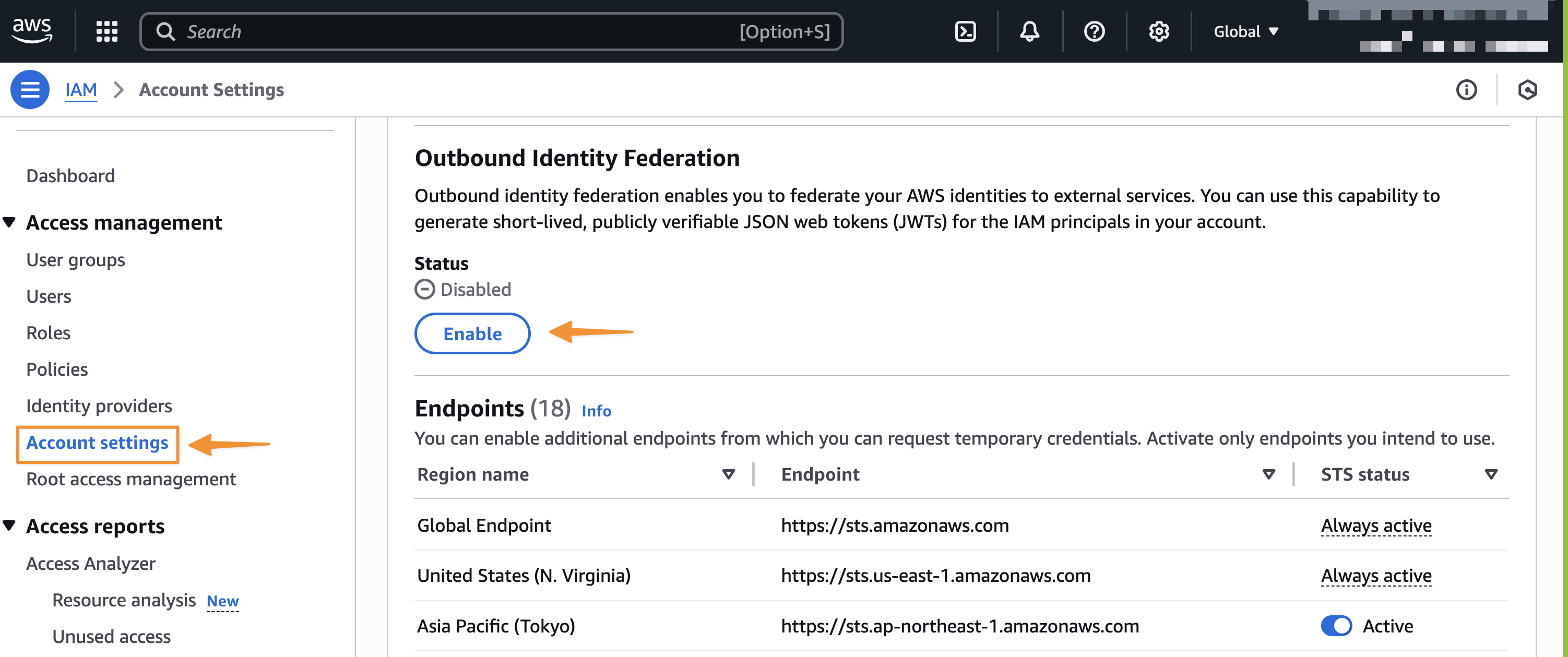 To begin using this feature, I need to enable outbound identity federation for my AWS account. I navigate to IAM and choose Account settings under Access management in the left-hand navigation pane.