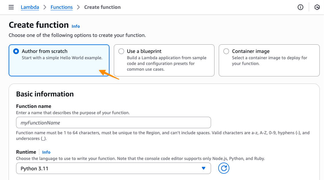 First, on the Create function page in the AWS Lambda console, I choose Author from scratch option.