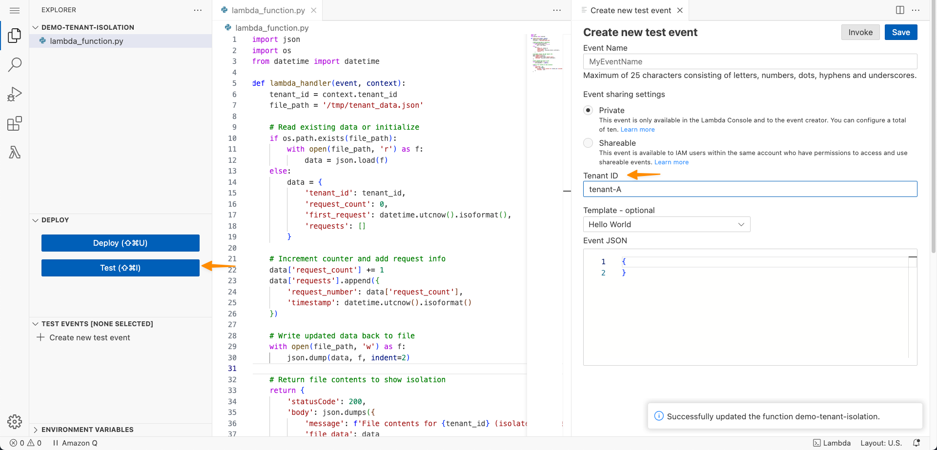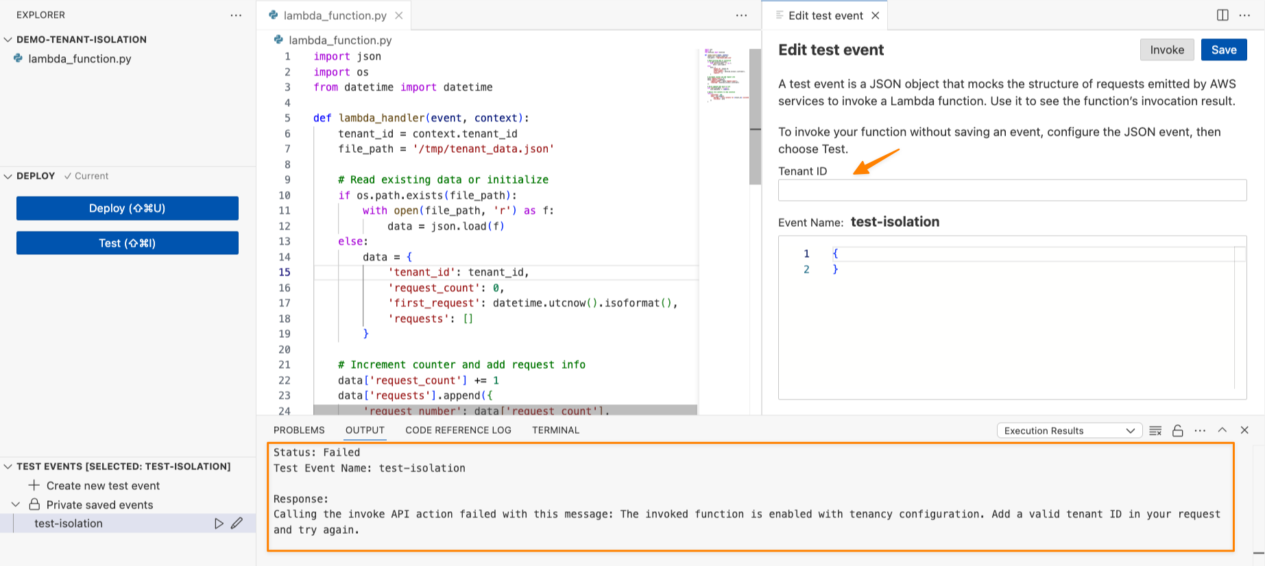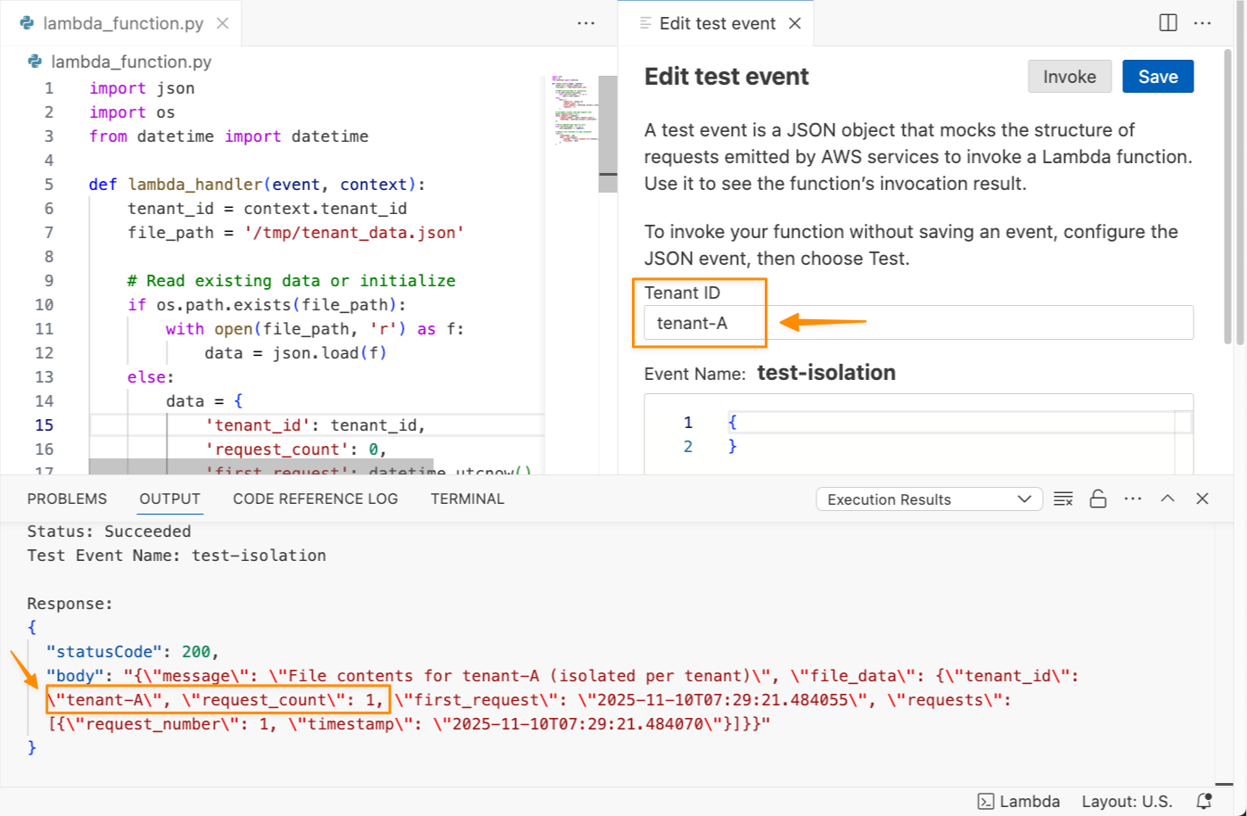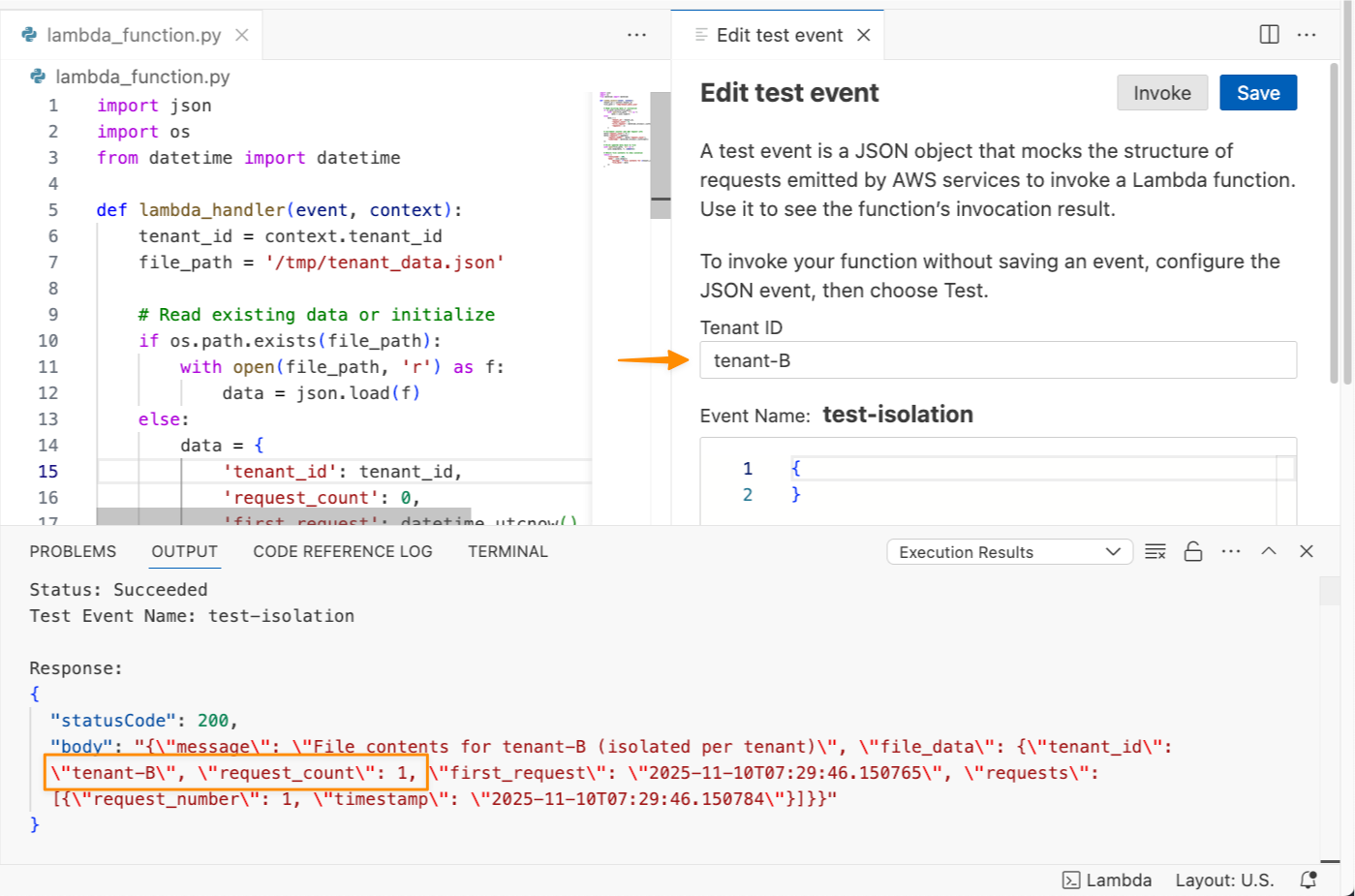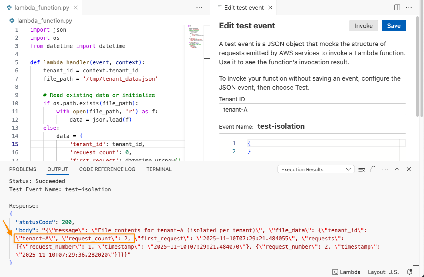 The last invocation returned request_count: 1 because I never invoked this function with tenant-B. Each tenant’s invocations will use separate execution environments, isolating the cached data, global variables, and any files stored in /tmp.