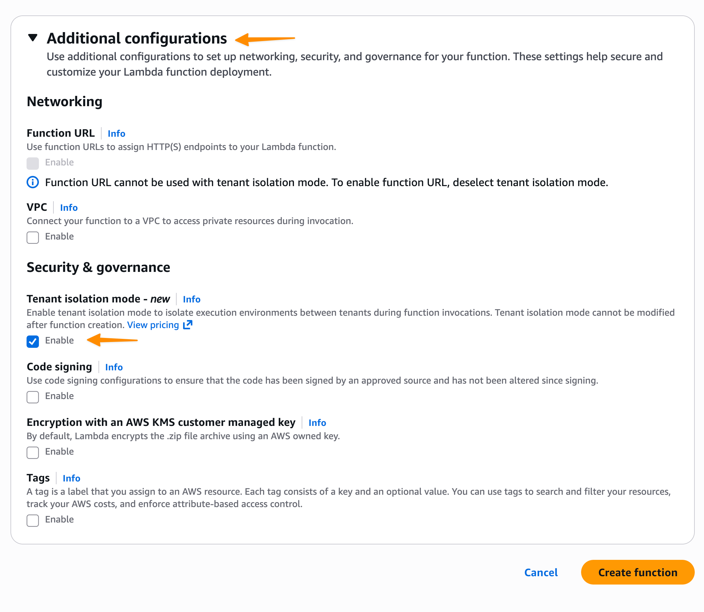 Here’s how you can enable tenant isolation mode in the AWS Lambda console: