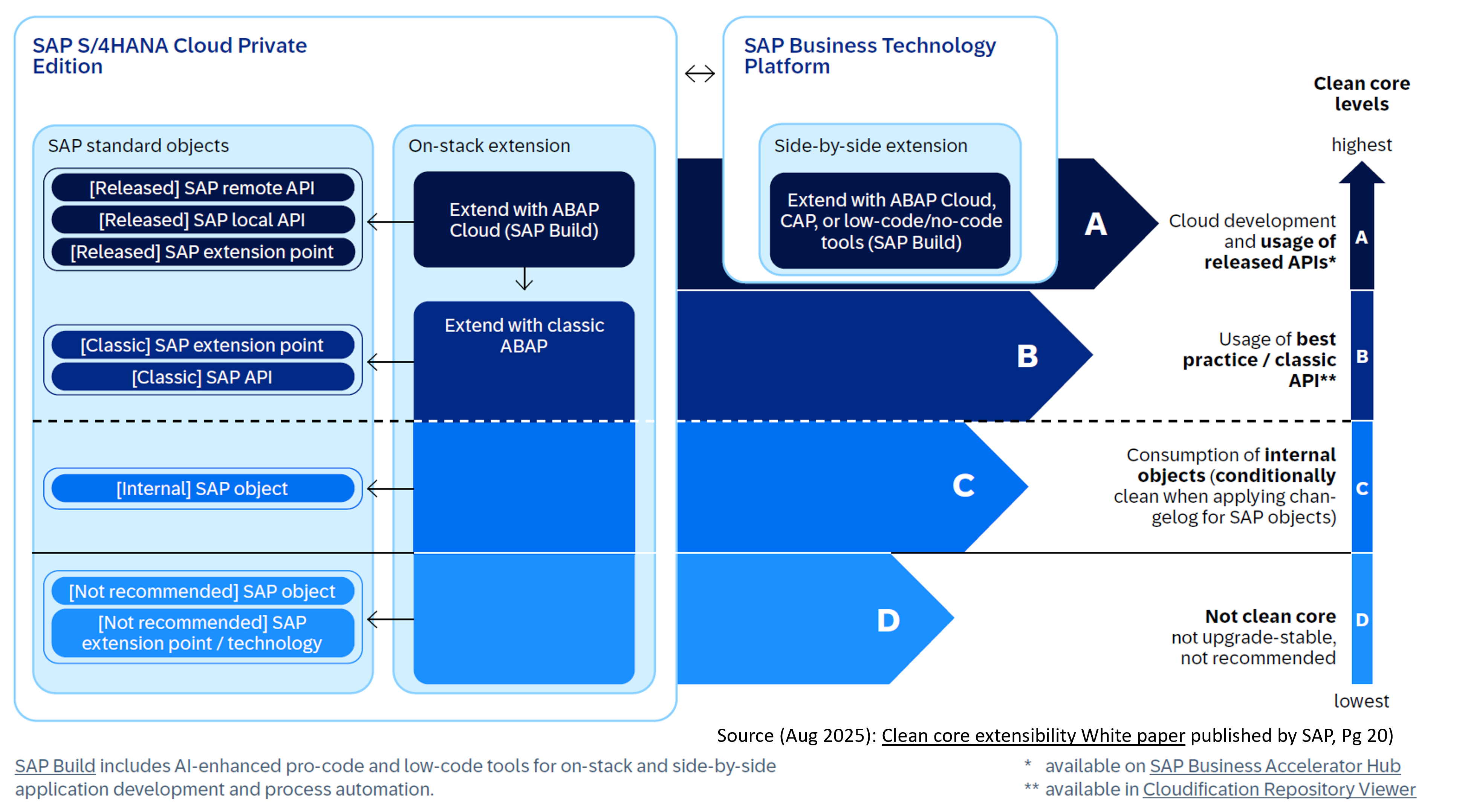 Custom code that depends on internal SAP objects creates upgrade risk. Clean Core governance quantifies and reduces that risk through ABAP Cloud development model, keeping the system maintainable as SAP evolves. In August 2025, SAP released the new maturity model, as the graphic below shows, which classifies custom development across Levels A – D instead of binary designation of clean vs not clean. Whether you’re already on the journey or just getting started, following are the primary things you should focus on: